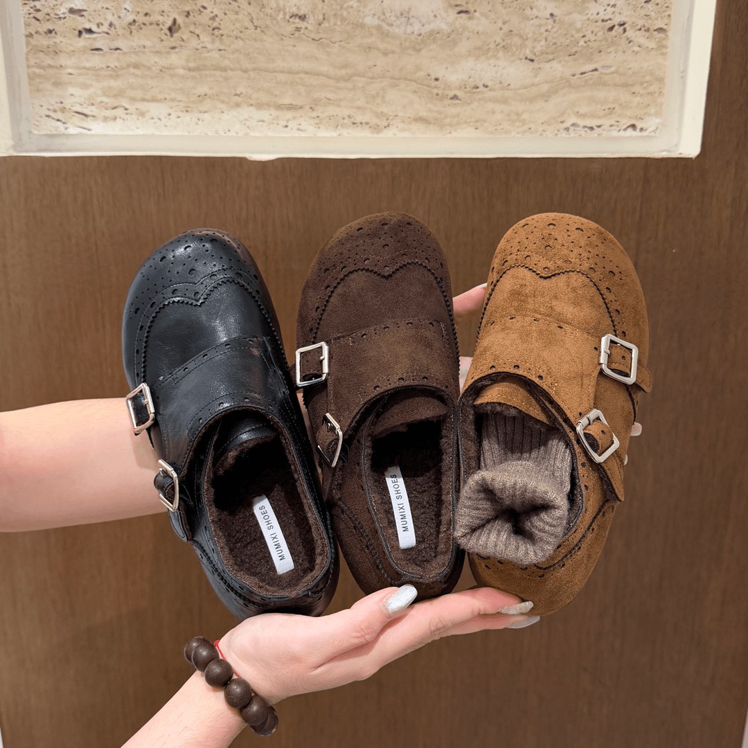 内增高复古双扣带雕花加绒休闲鞋女2025冬季保暖软底懒人鞋勃肯鞋