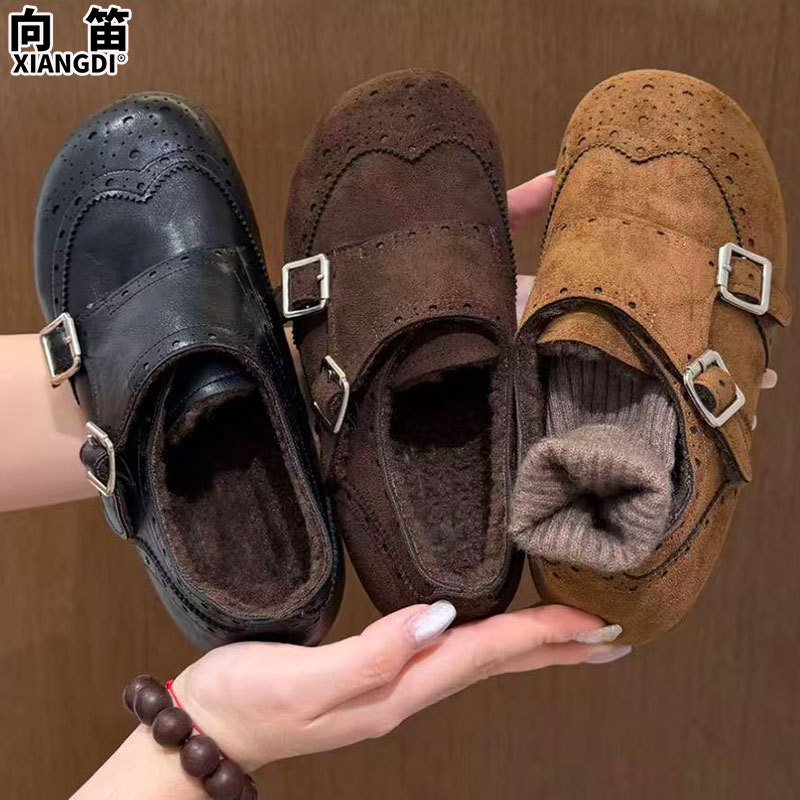 英伦风加绒全包勃肯鞋小皮鞋女2025冬季新款布洛克豆豆棉鞋乐福鞋