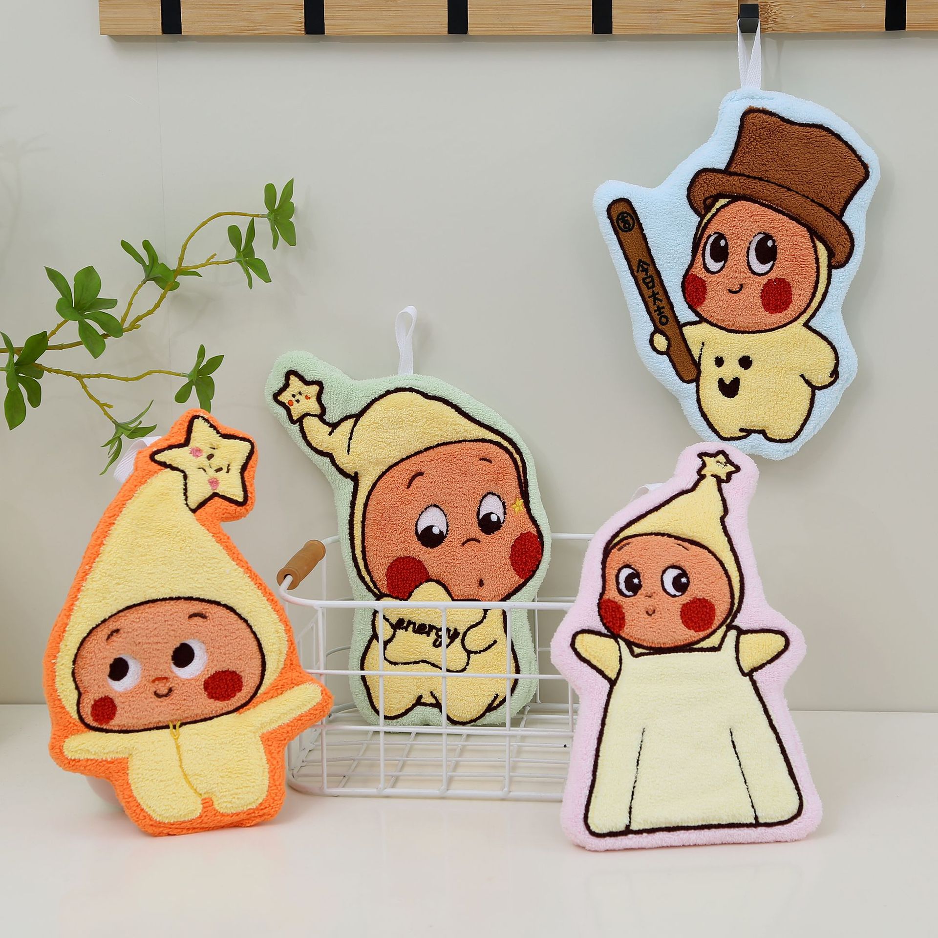 かわいい漫画柄の手拭きタオル、厚手の吊り下げ式デザイン、バスルームやキッチン用の柔らかい吸水性のあるコーラルベルベットの手拭きタオル