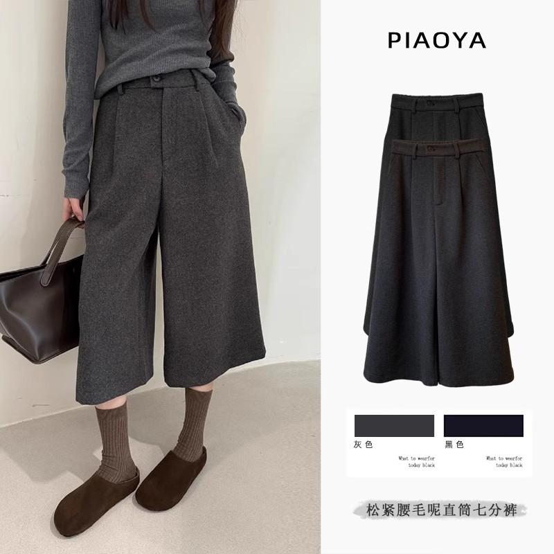 小个子宽松休闲醋酸羊毛裤黑灰色七分毛呢阔腿裤女春秋季2025新款