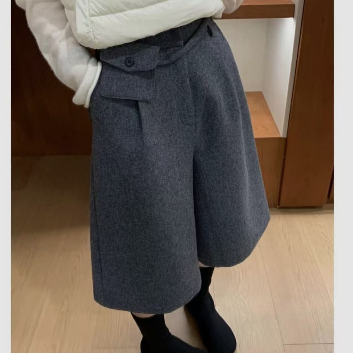 秋冬简约高腰灰色毛呢宽松裤女中裤腰包短裤2025新款显瘦样布呢子