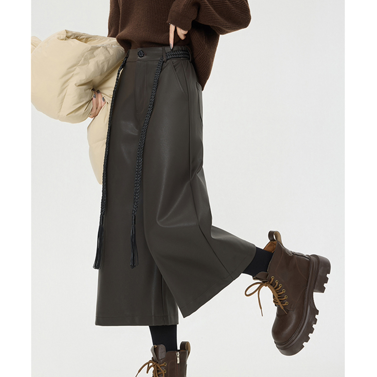 微胖mm秋冬新款咖色pu皮裤七分阔腿裤女小个子宽松直筒八分皮裤子