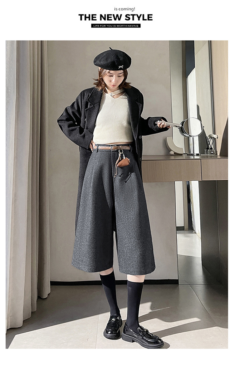 大码灰色毛呢西装短裤女秋冬配靴子外穿五分裤中裤高腰六分阔腿裤