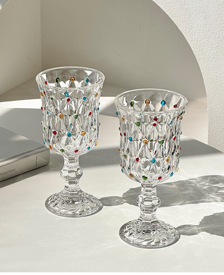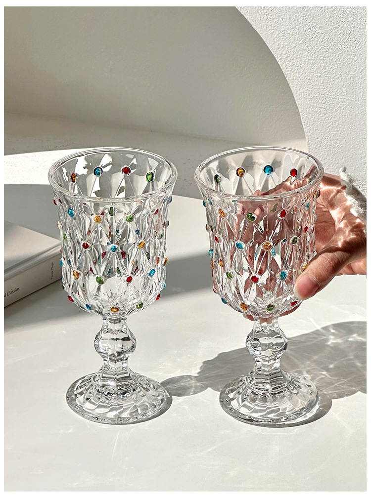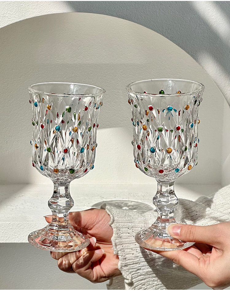 彩绘法式浮雕杯创意珠点高脚玻璃杯家用高颜值红酒杯精致香槟杯