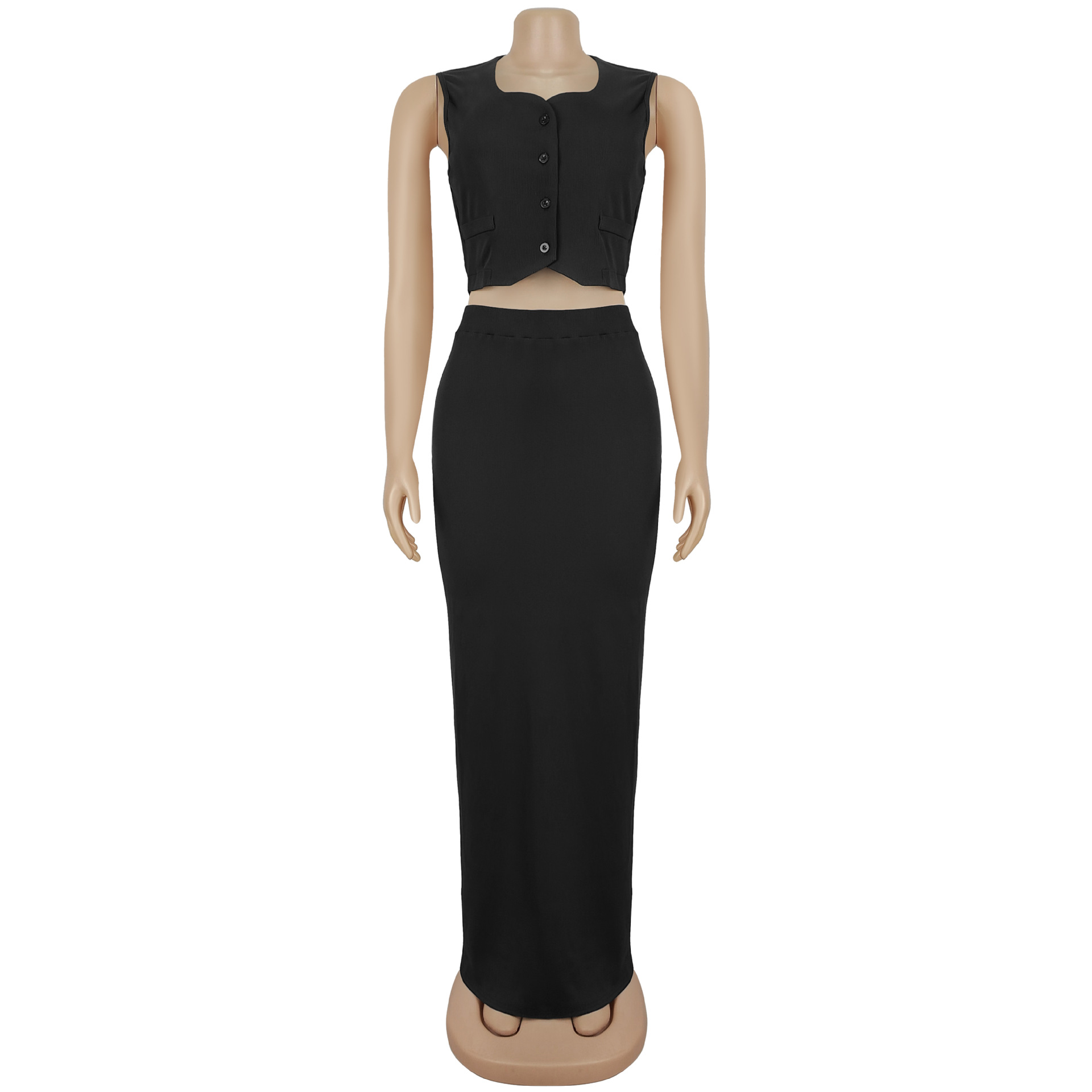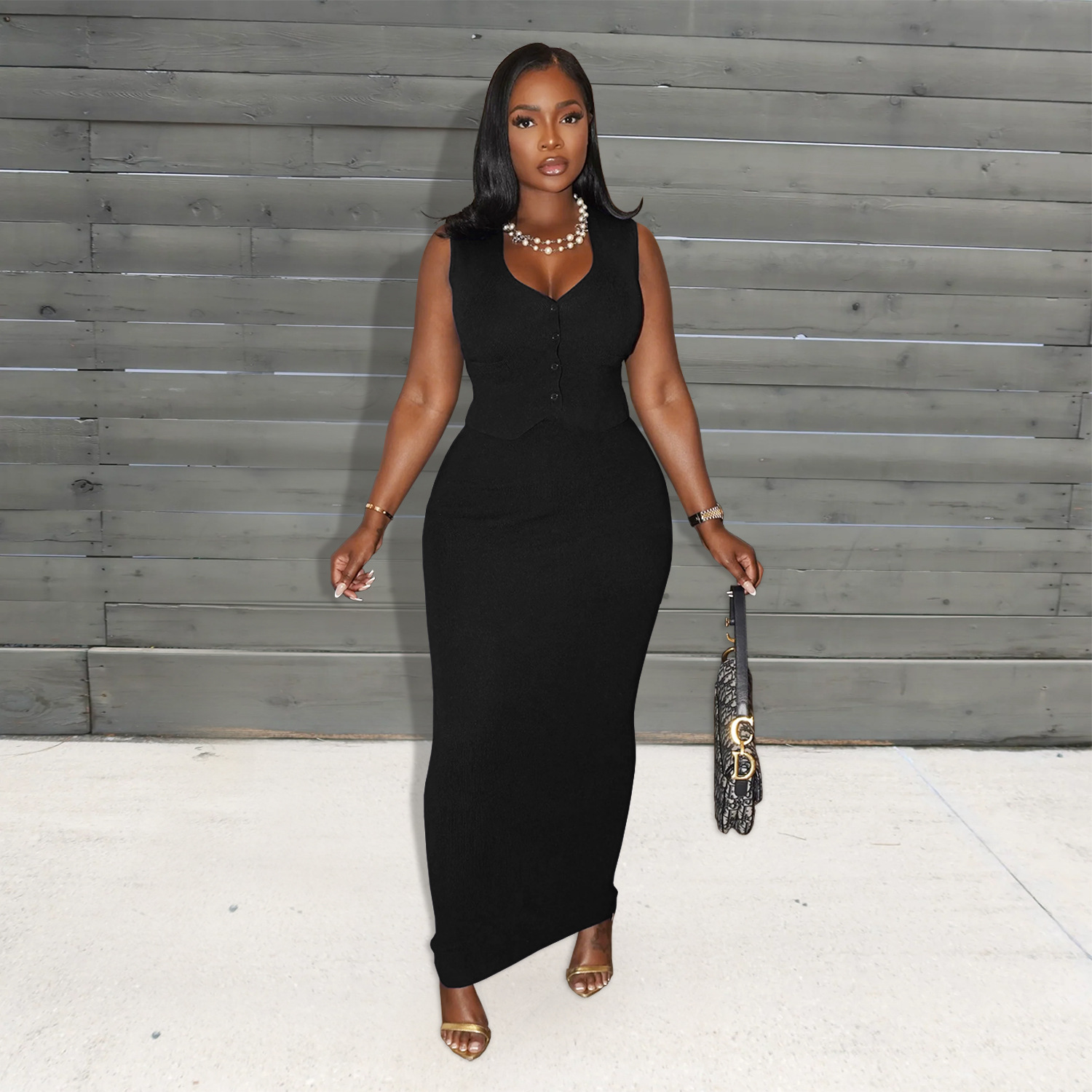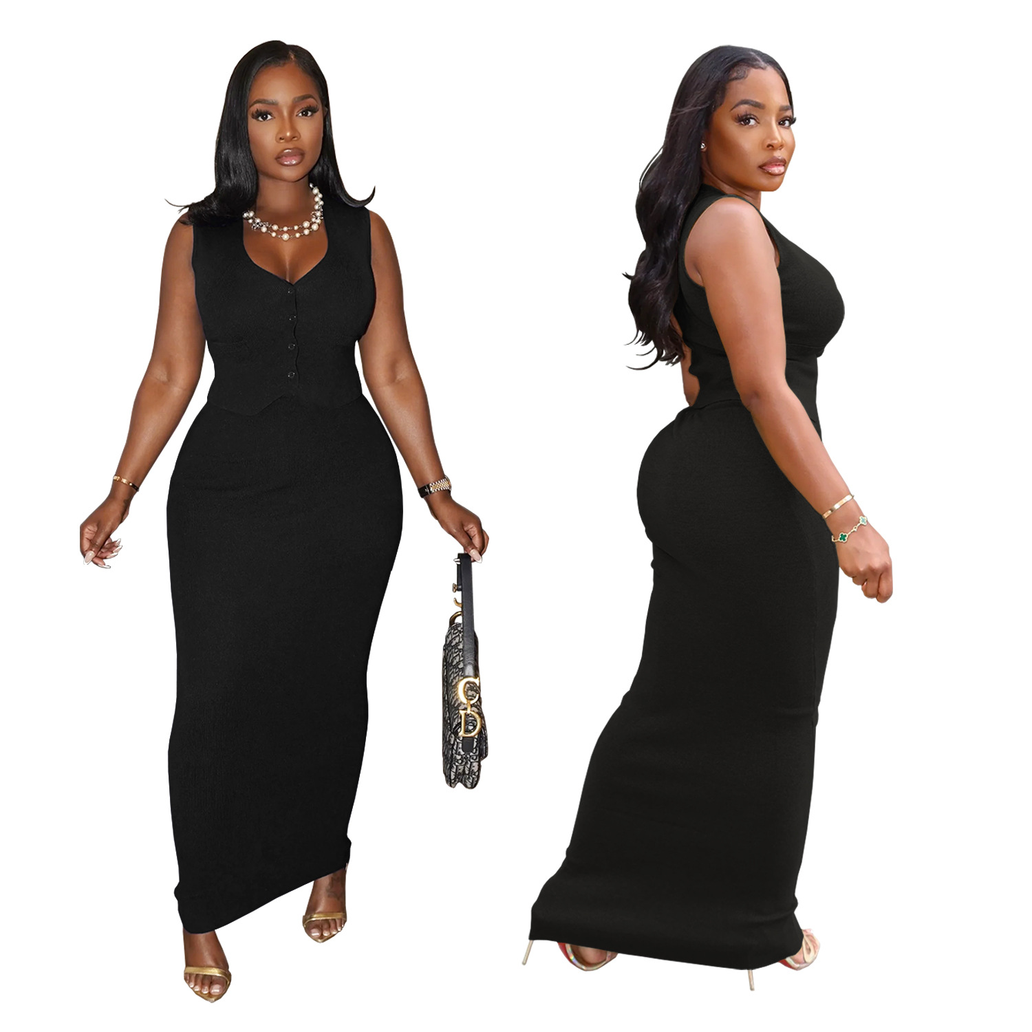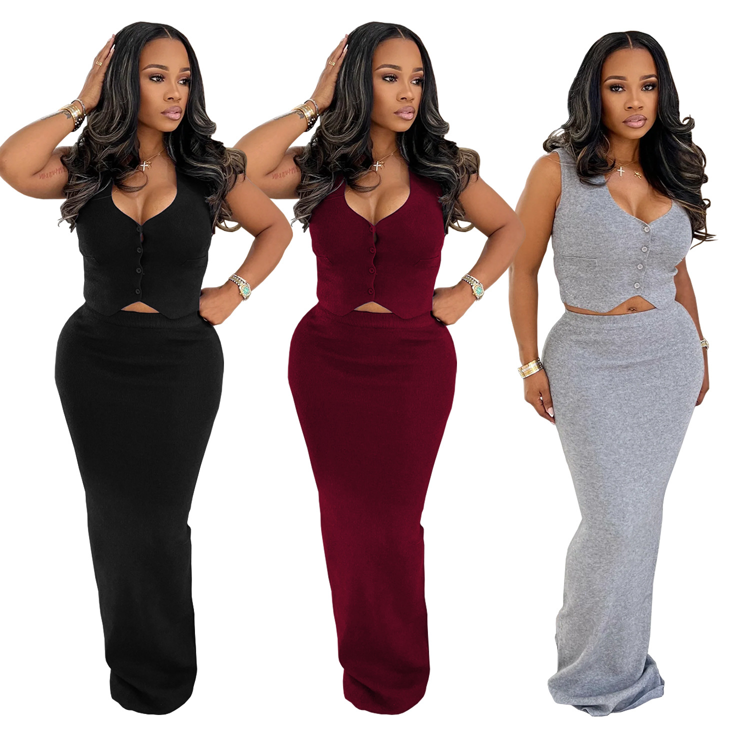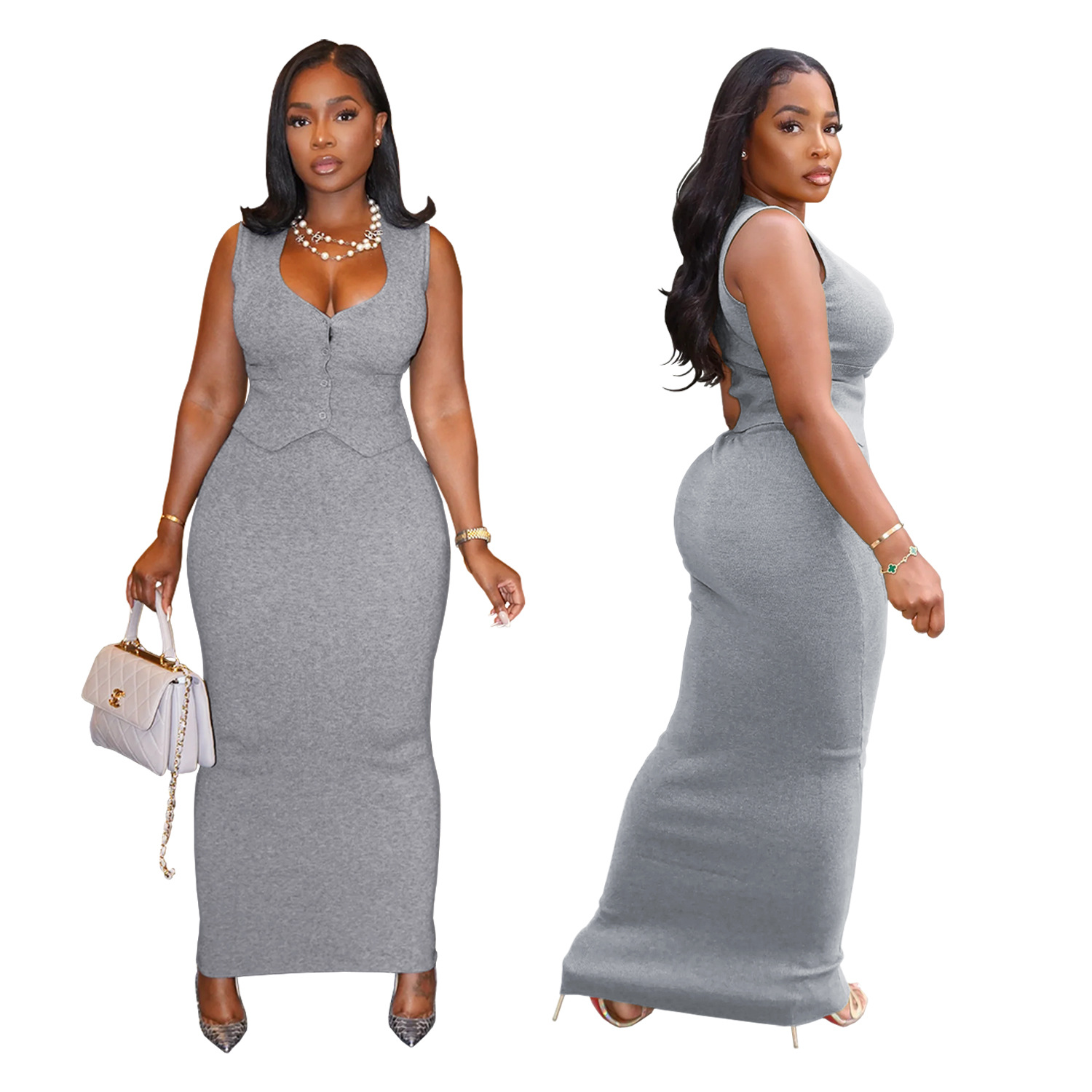 C7576跨境速卖通亚马逊欧美时尚女装休闲纯色纽扣上衣长裙两件套