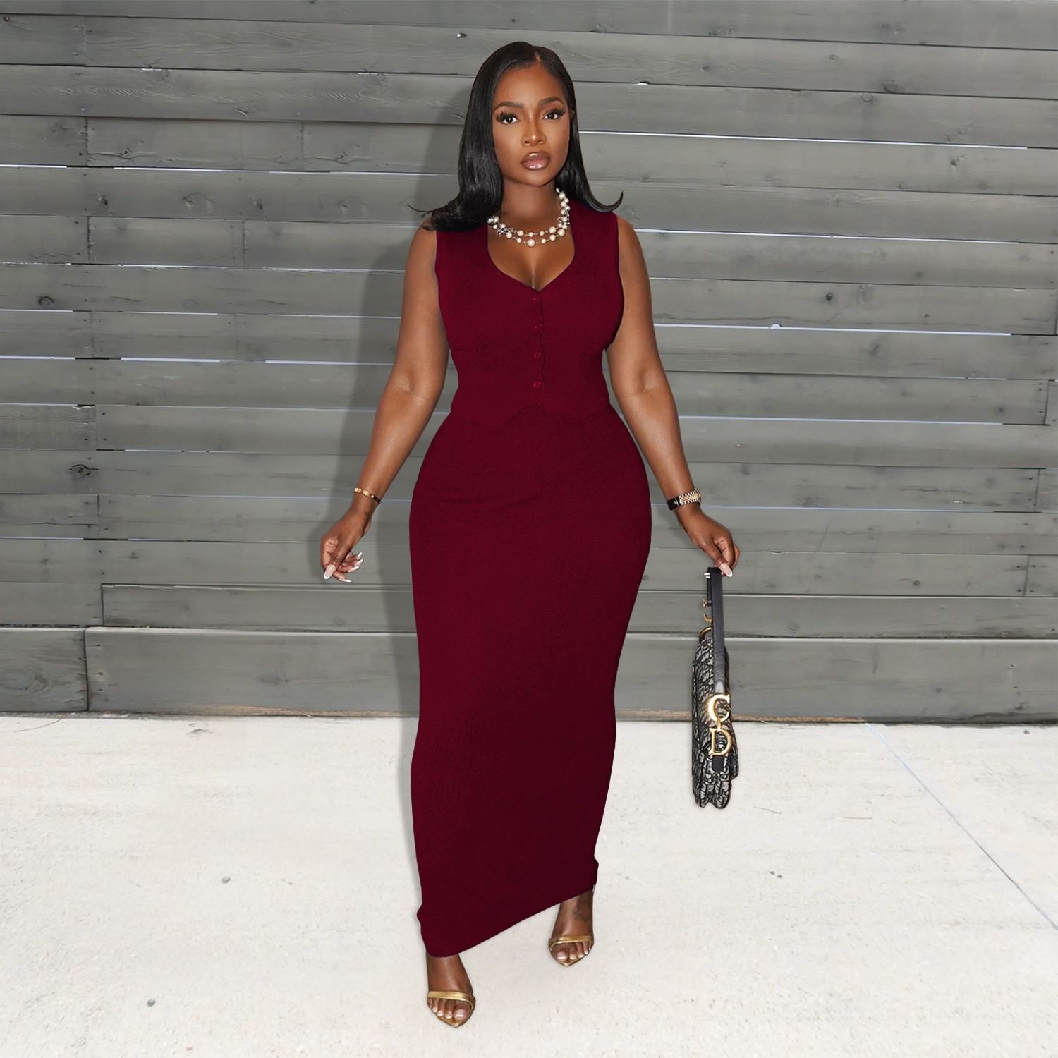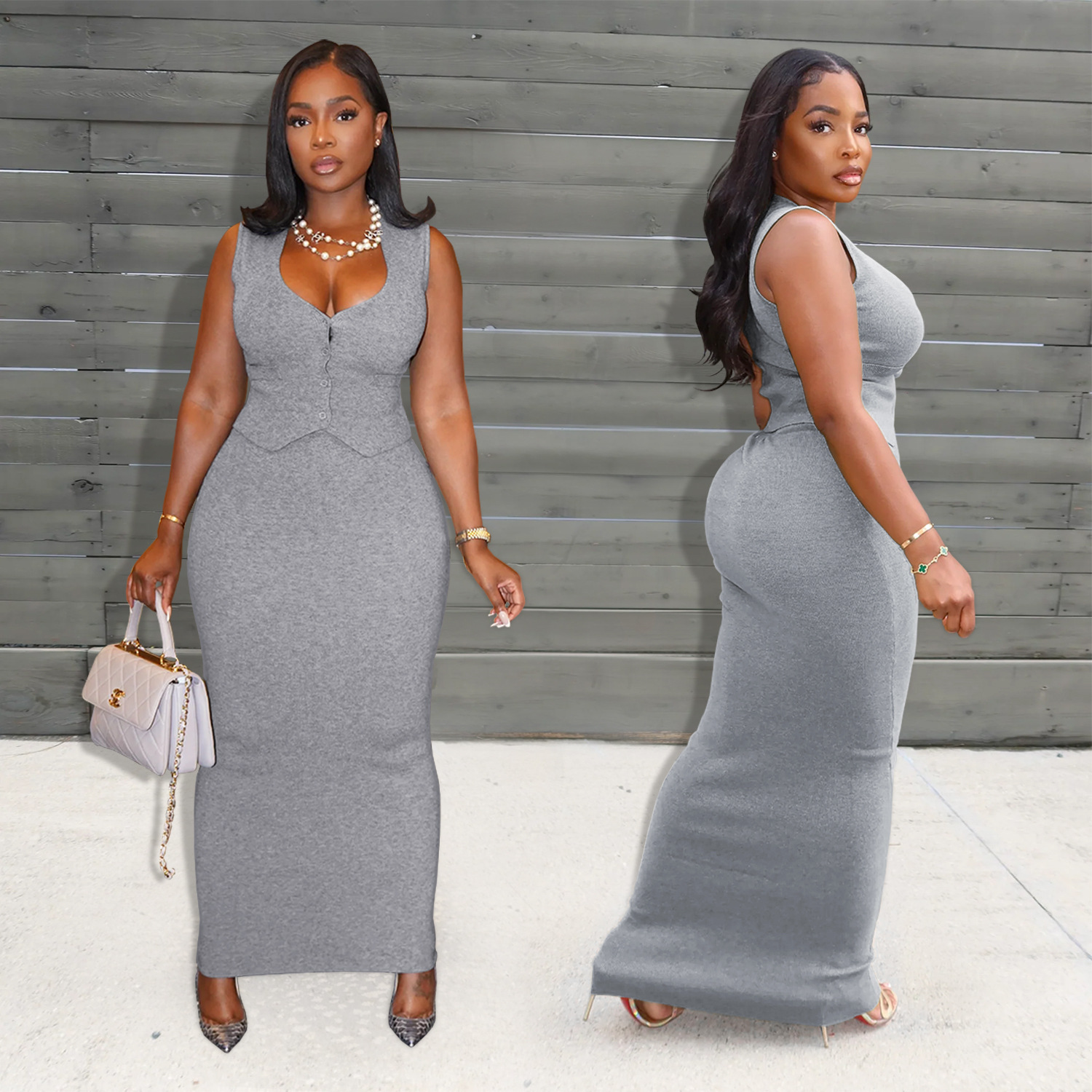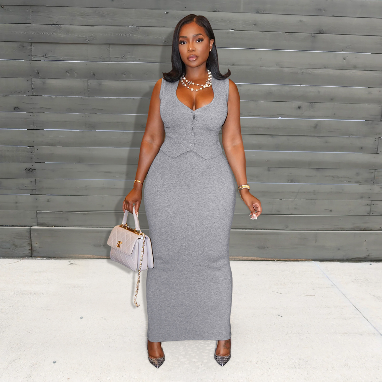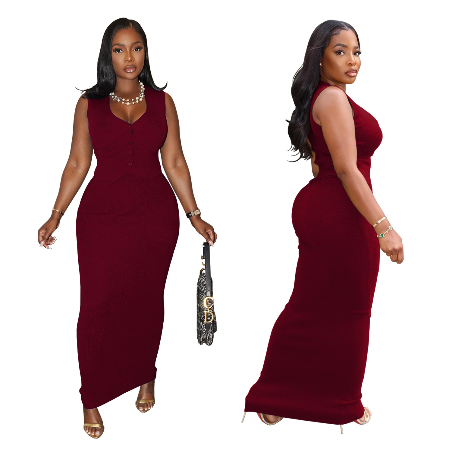 C7576跨境速卖通亚马逊欧美时尚女装休闲纯色纽扣上衣长裙两件套