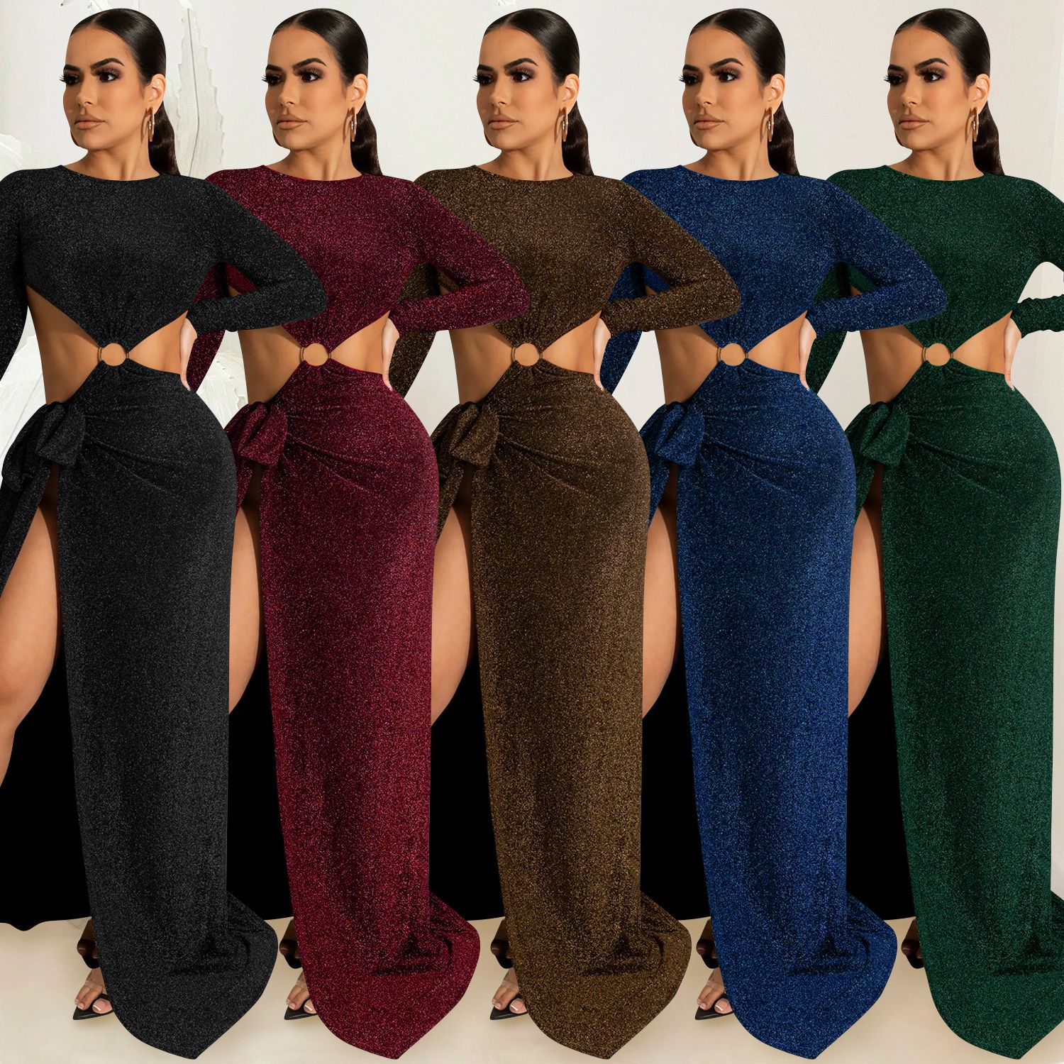 C5550国境を越えた新商品速売アマゾンebay純色丸首長袖抜きフォークロングワンピース