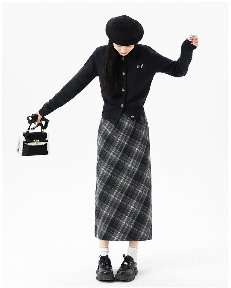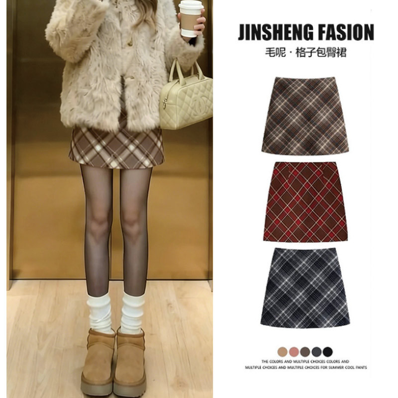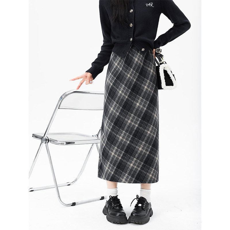 レトロなウールチェック柄スカート レディース 秋冬 2025年新作 ハイウエストAライン 小柄さん向け ヒップスカート ミディアム丈