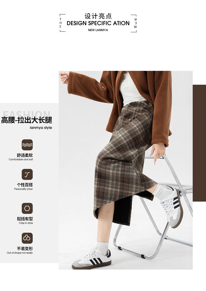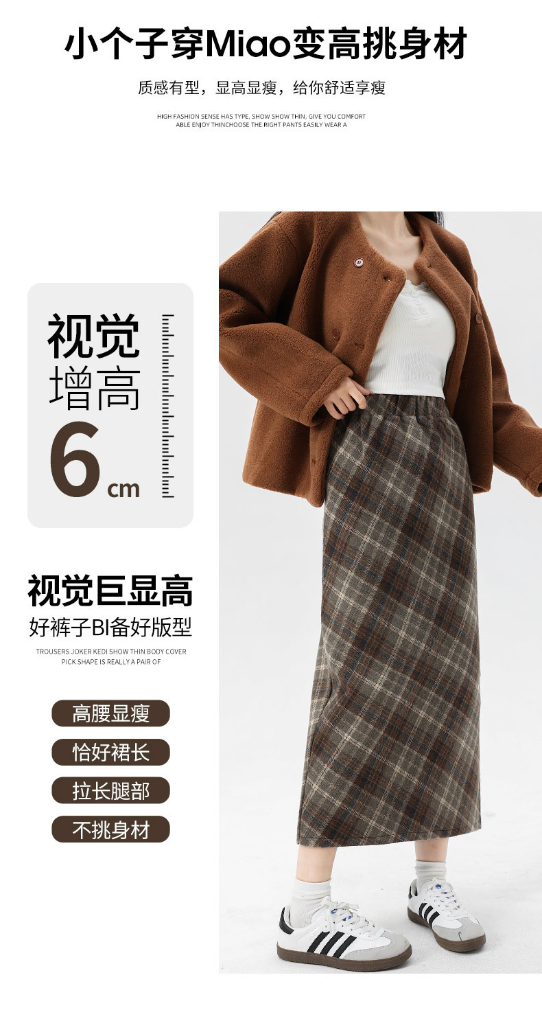 灰色毛呢格子半身裙女冬季加绒中长裙高腰a字显瘦直筒韩系包臀裙