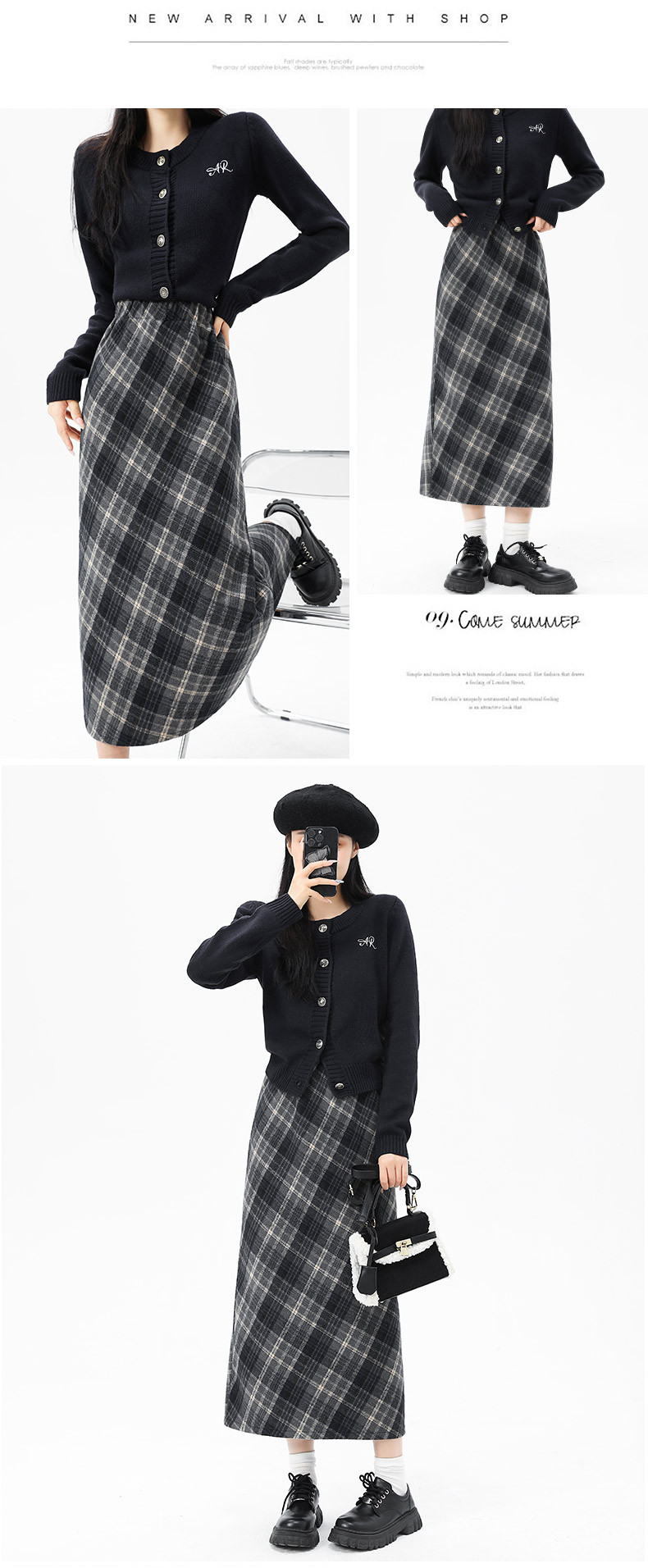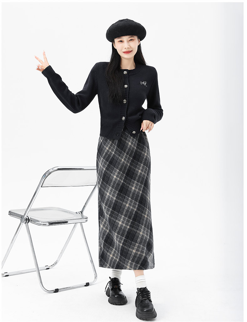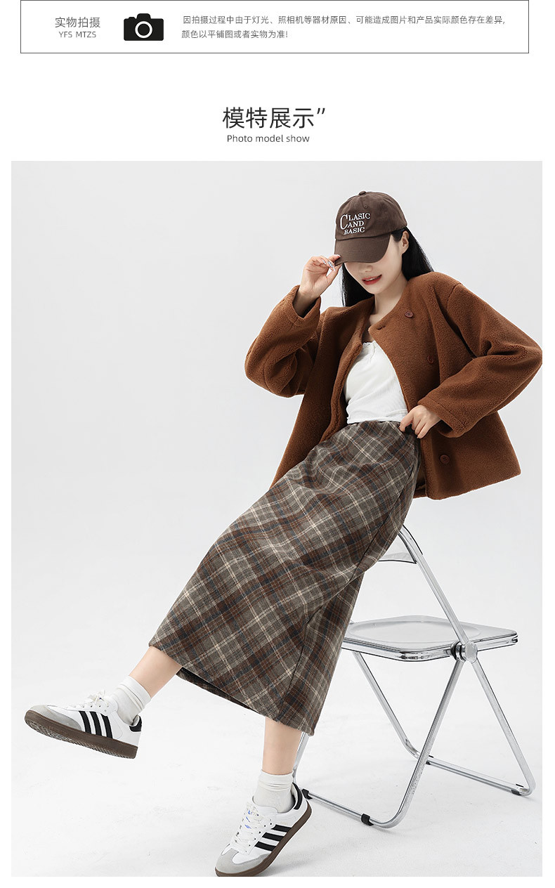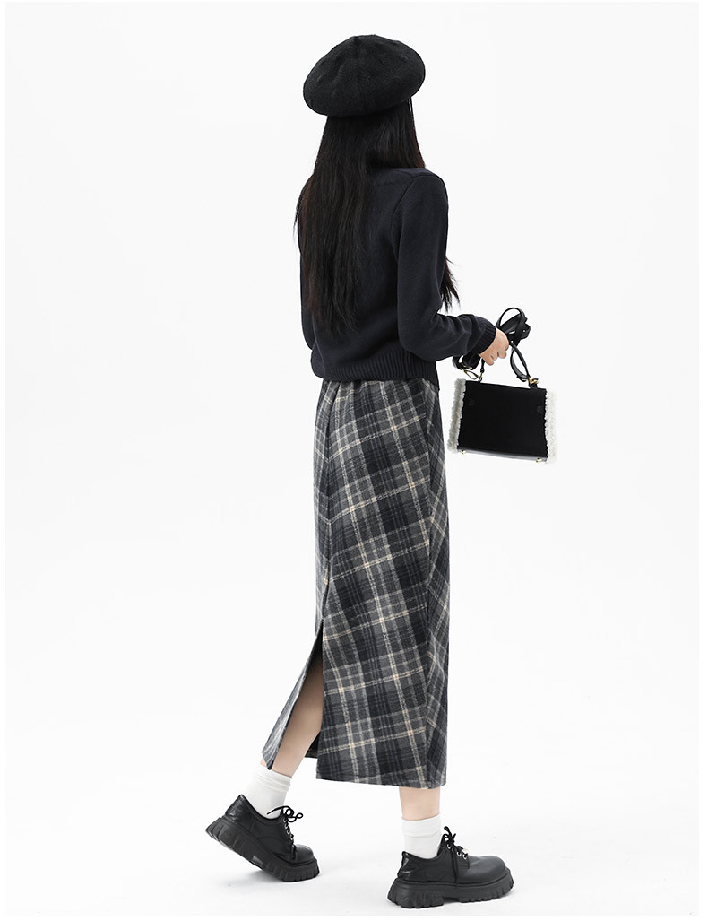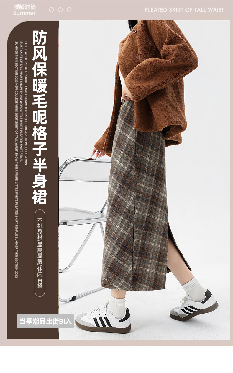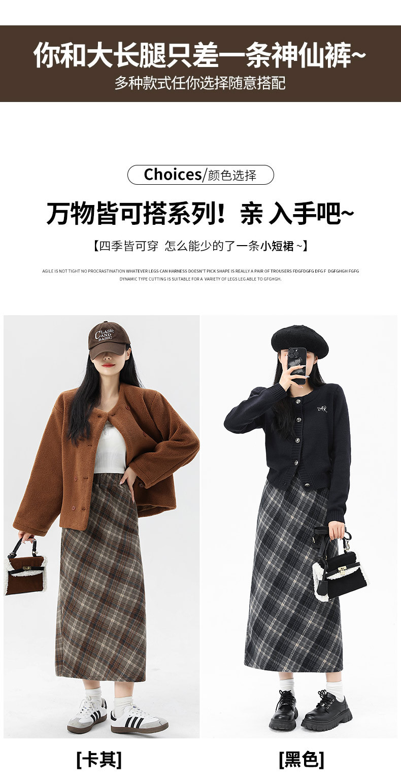 格子开叉半身裙女秋冬季2025新款修身小个子毛呢中长款a字包臀裙