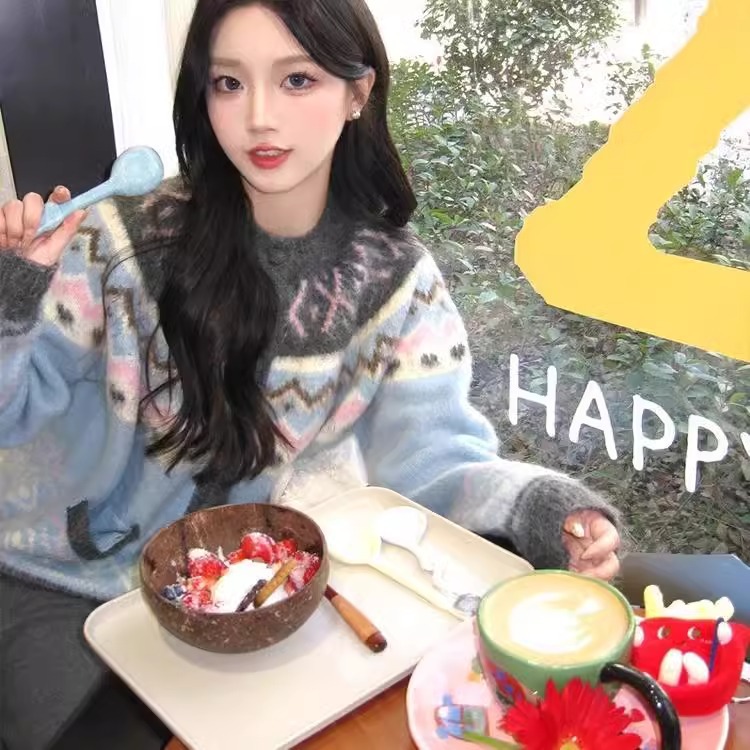 复古提花圆领套头费尔岛加厚毛衣女秋冬款宽松撞色长袖针织打底衫