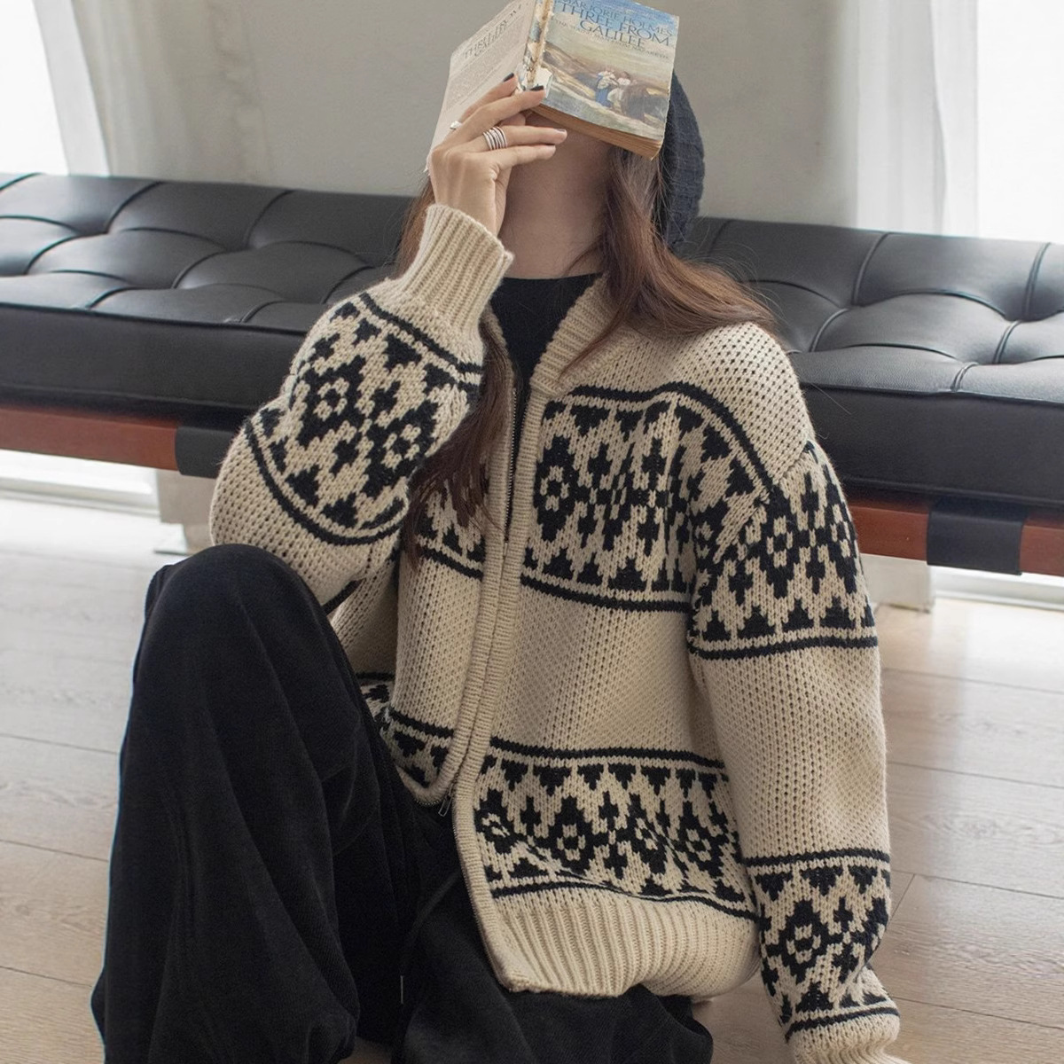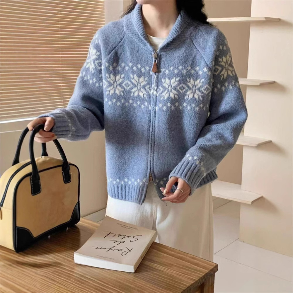 撞色提花毛衣女秋冬复古费尔岛新款慵懒风宽松双拉链针织开衫外套