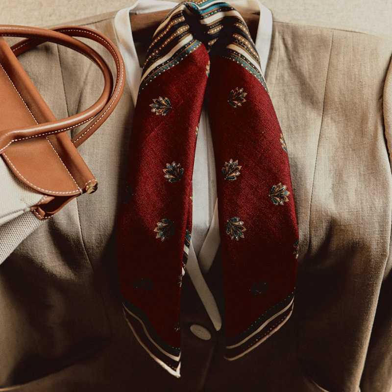 茶色の波点シルクタオルのプリントの高級な百合アクセサリーは首の女性の2025年の新型のヘアバンドを結んで長いマフラーを結びます。