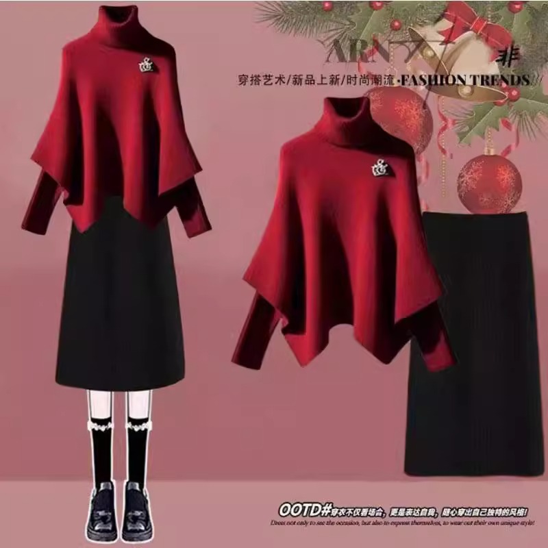 冬にはスーツを着ています。女性2025新型高級高襟マント赤いセーター高腰スカート2点セット