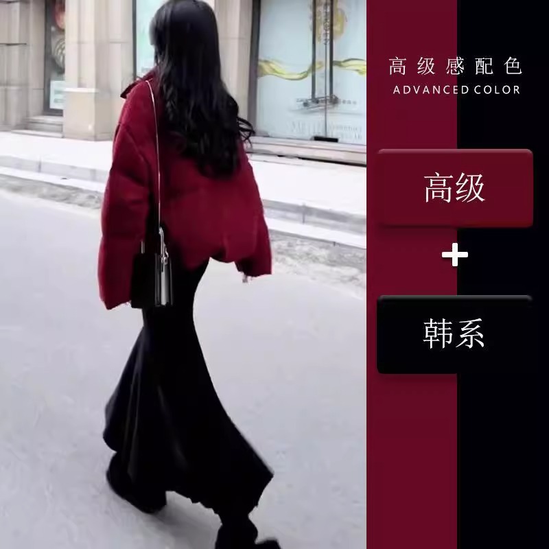 冬にはスーツを着ています。女性の新年の雰囲気感が短い赤い綿のコートには、西洋風の尾のスカートが2つセットあります。