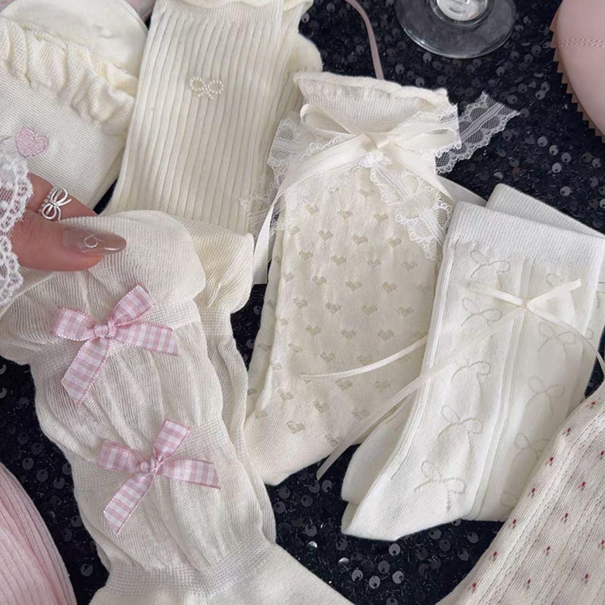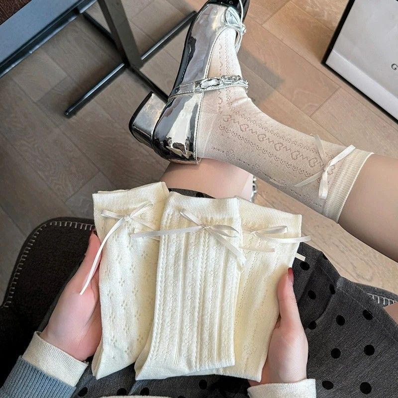 蝶ネクタイソックスレディースミッドカーフソックス綿夏薄いレースかわいい日本の女の子耳パイルロングソックス