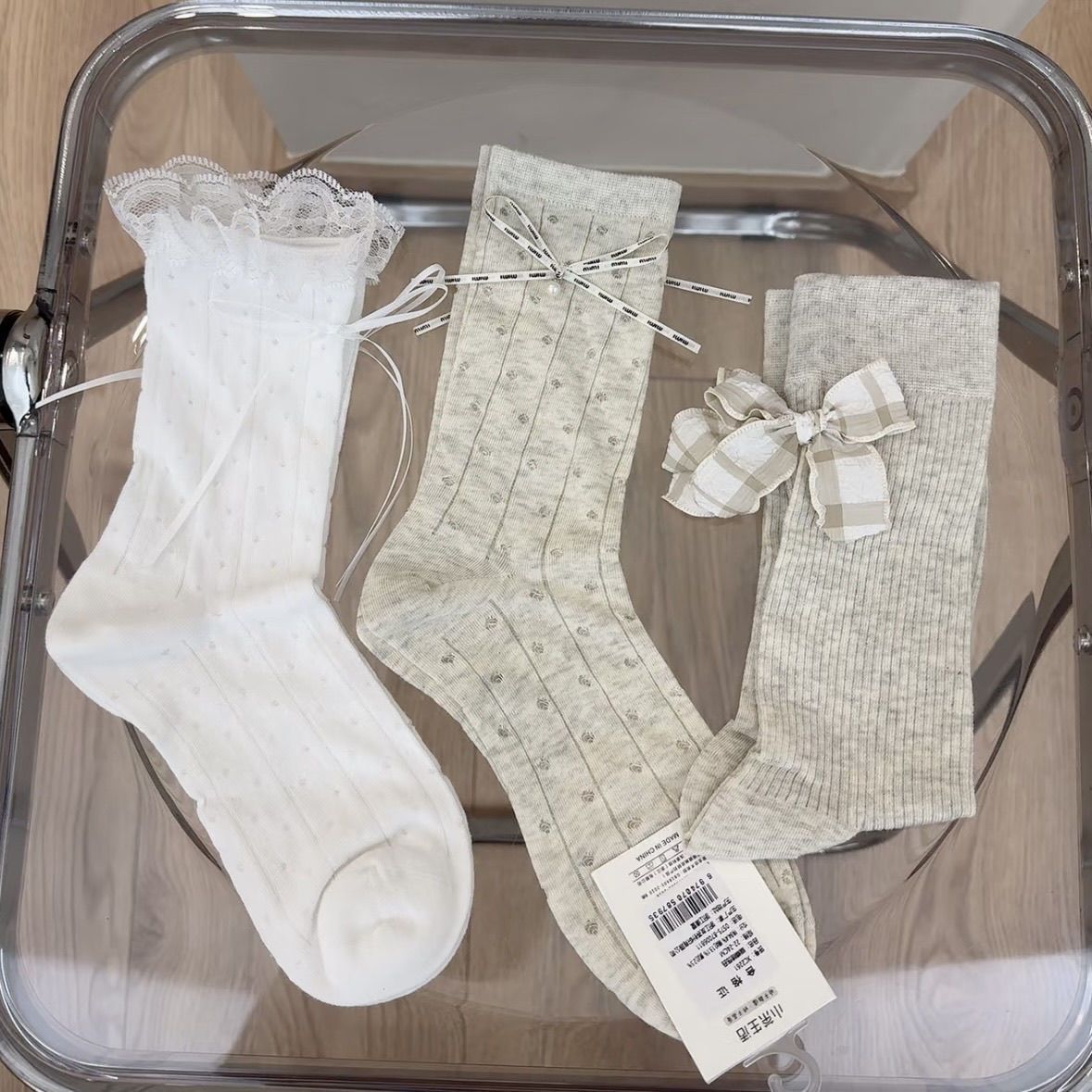 2025年初春レディースシンプル吸湿発散性ミッドカーフソックス韓国版インスイートレースリボン多用途