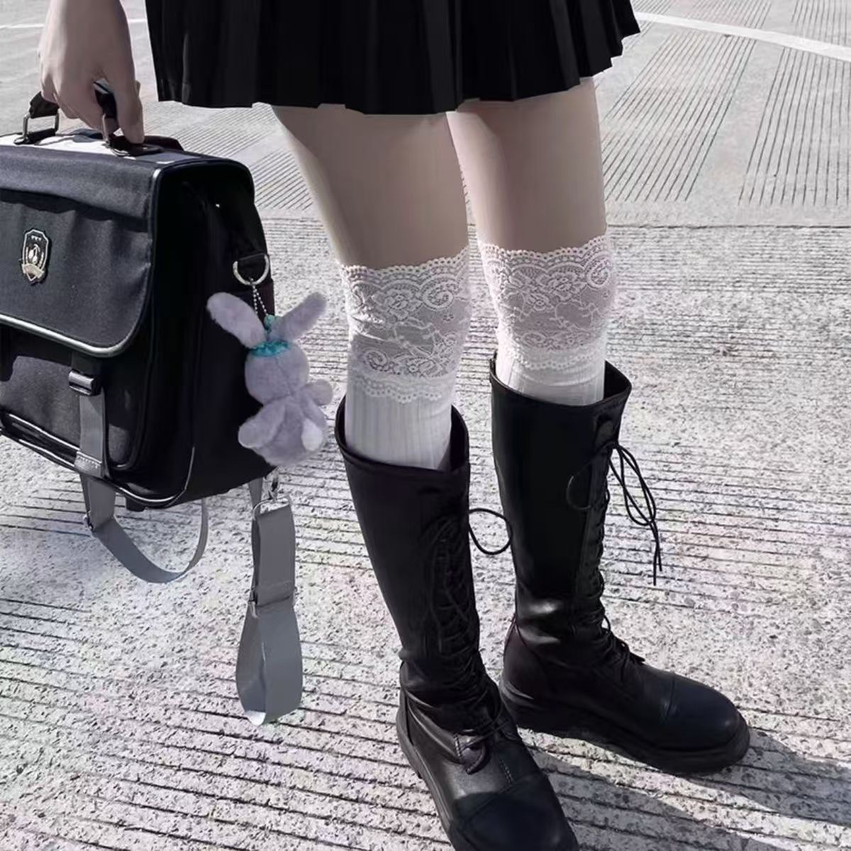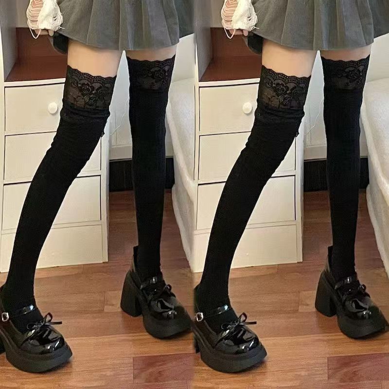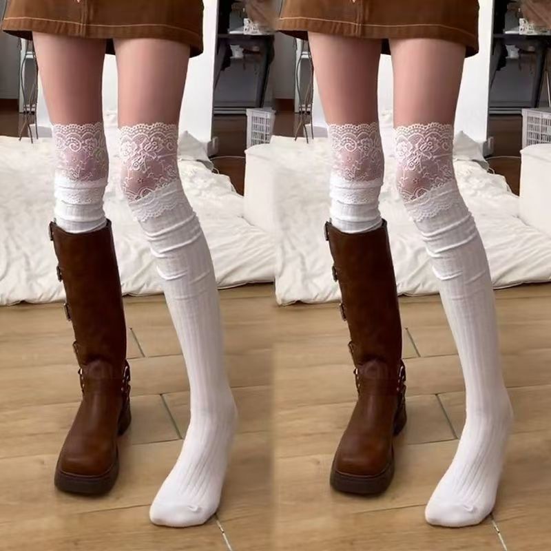 蕾丝拼接过膝长筒袜女秋冬竖纹显瘦纯欲风大腿袜jk日系甜美