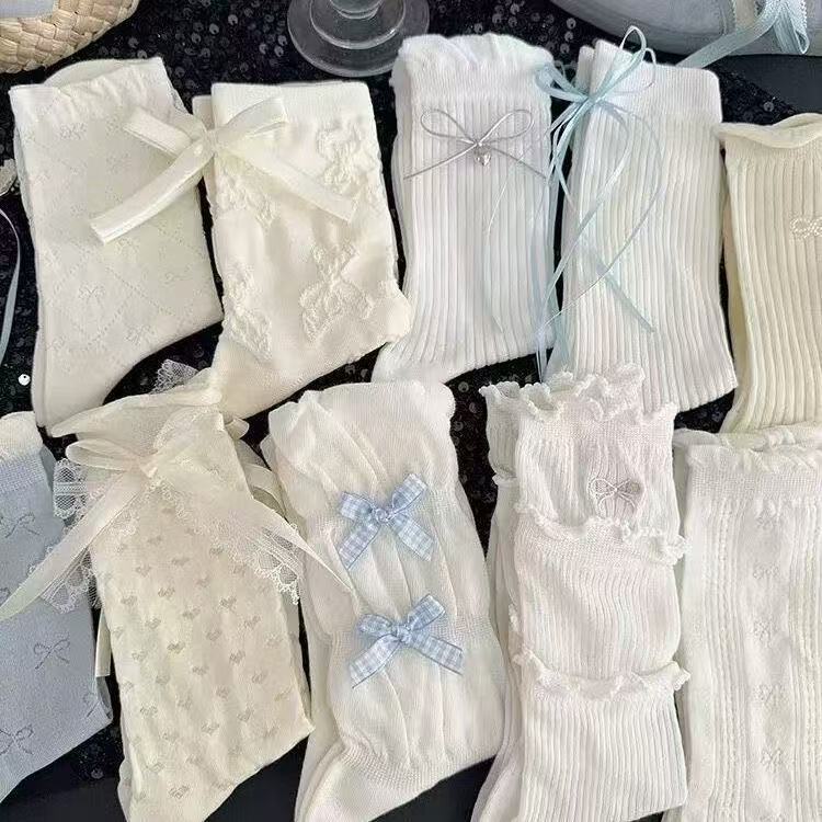 春夏新作ロリータリボンスイートパイルソックス白ミッドチューブJKレースカーフソックス