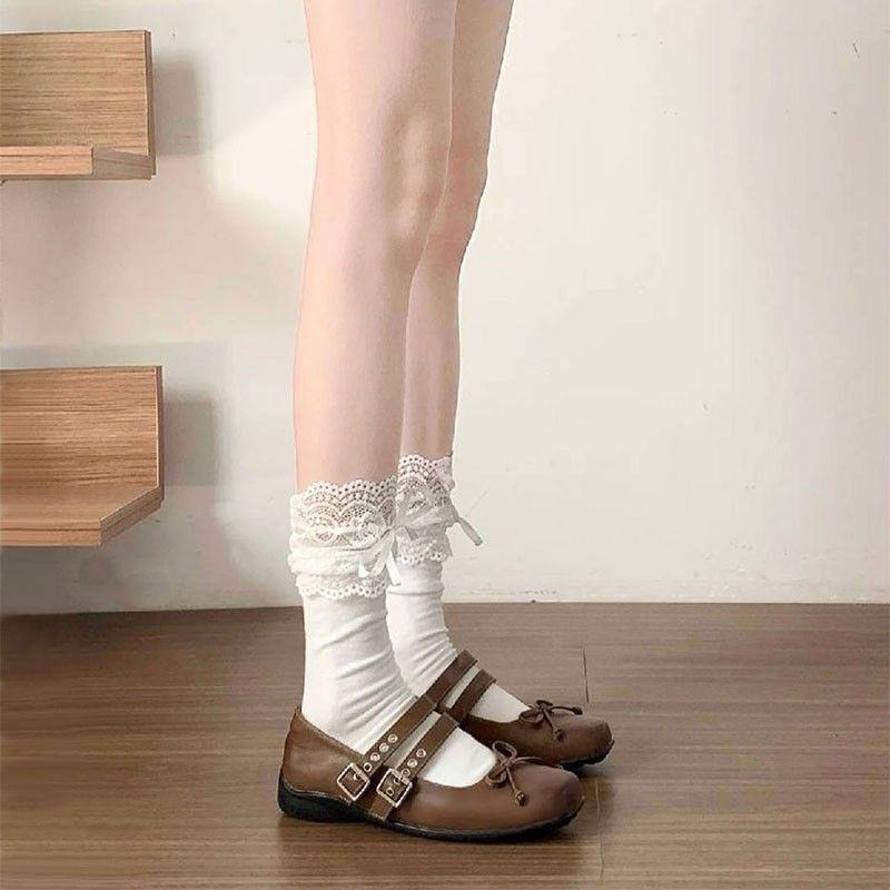 レースリボンロリータソックス女性用かわいい日本製jk白カーフソックス甘いミッドチューブパイルソックス