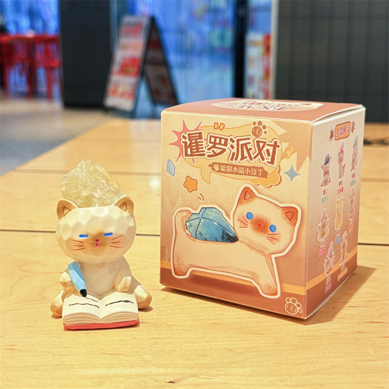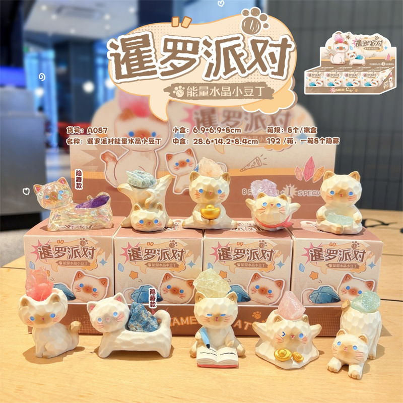 创意暹罗派对水晶摆件盲盒创意能猫猫能量石摆件礼品小豆丁盲盒