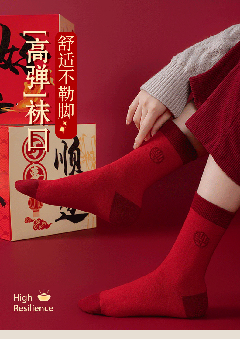 礼盒装马年本命年红袜子女款秋冬季纯棉袜双针双路大红色新年礼物
