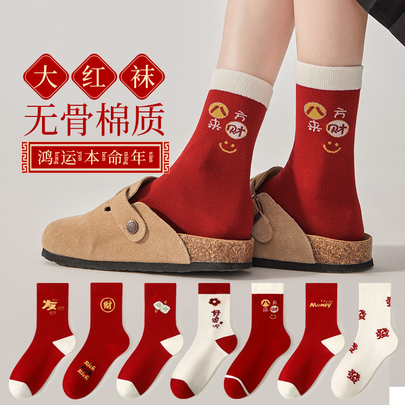 大红袜子男女同款本命年七星连珠鸿运袜蛇年新年结婚纯棉诸暨批发