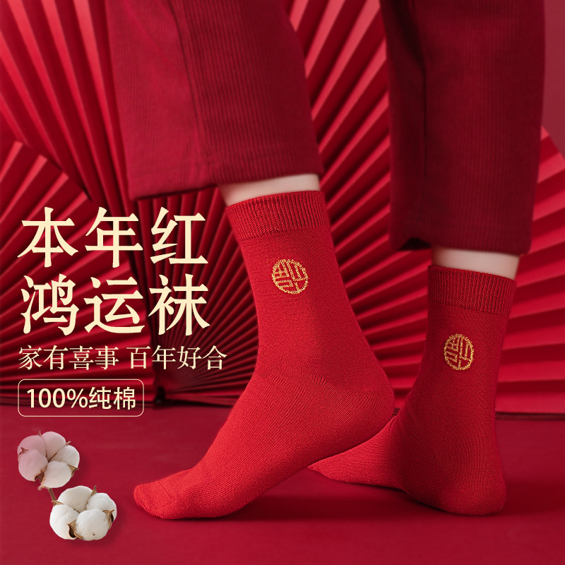 浪莎本命年赤い靴下 男性用 馬年 純綿 秋冬用 ミドル丈靴下 結婚式 カップル用 赤い女性用綿靴下