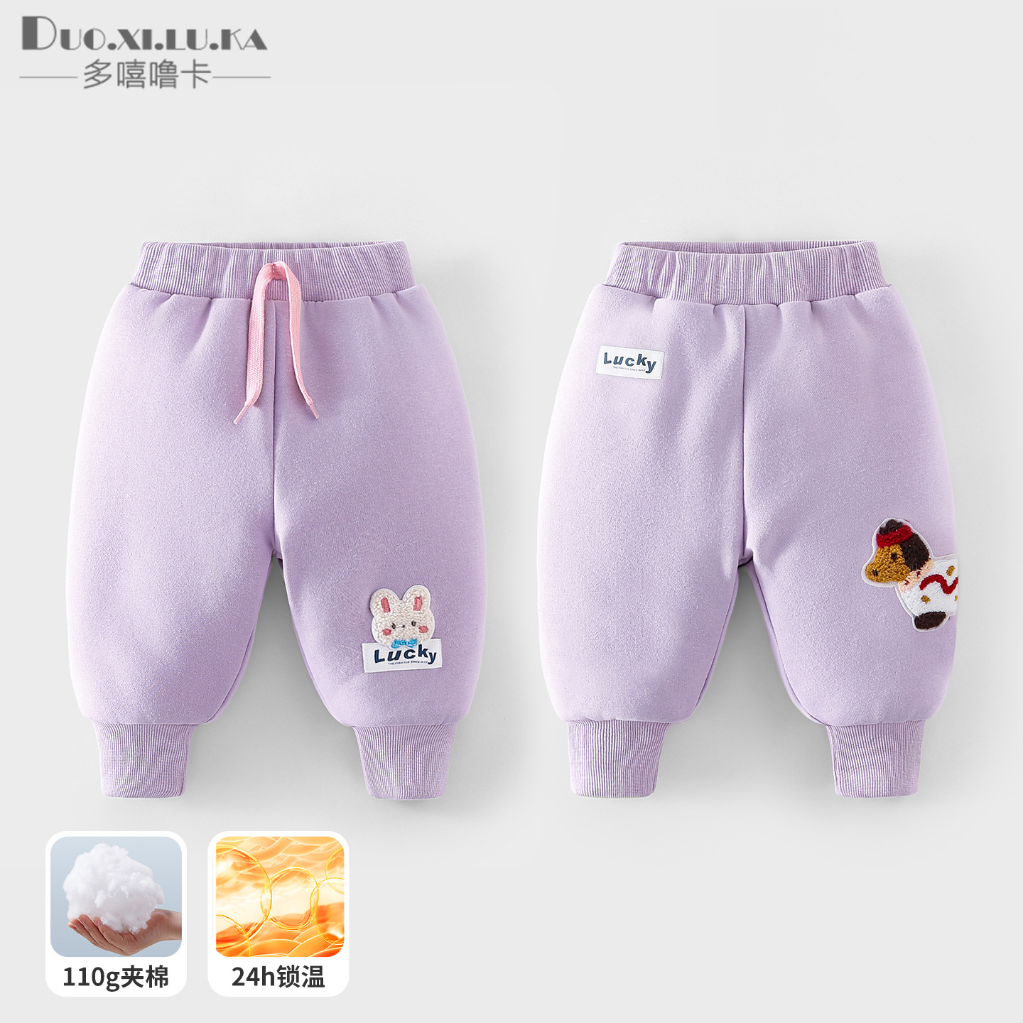 颜色 紫色线条兔,灰色夹棉裤子,粉色棉裤,麻灰加绒卫裤,lucky熊【浅麻灰】,lucky熊【深麻灰】,花纹口袋【墨兰】,曲奇饼干【紫】,小熊布贴【浅麻灰】,条纹小熊【浅麻灰】,白色腊肠狗【紫】