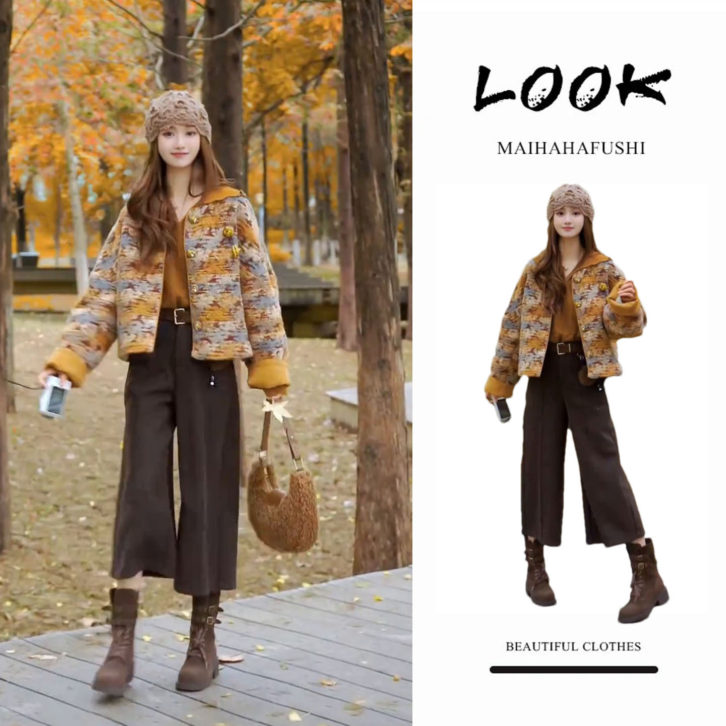 单件/新中式国风气质减龄短款棉服外套搭配时尚高腰休闲阔腿裤潮