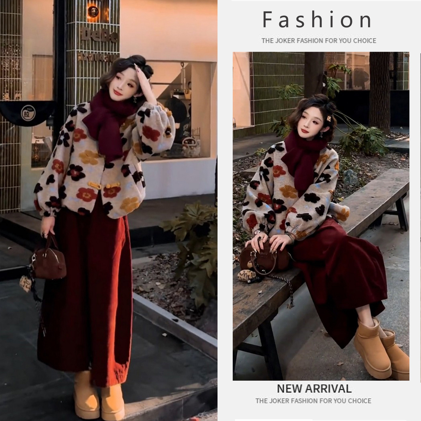 冬装搭配一整套高级感复古短款外套上衣女显瘦高腰红色阔腿裤套装