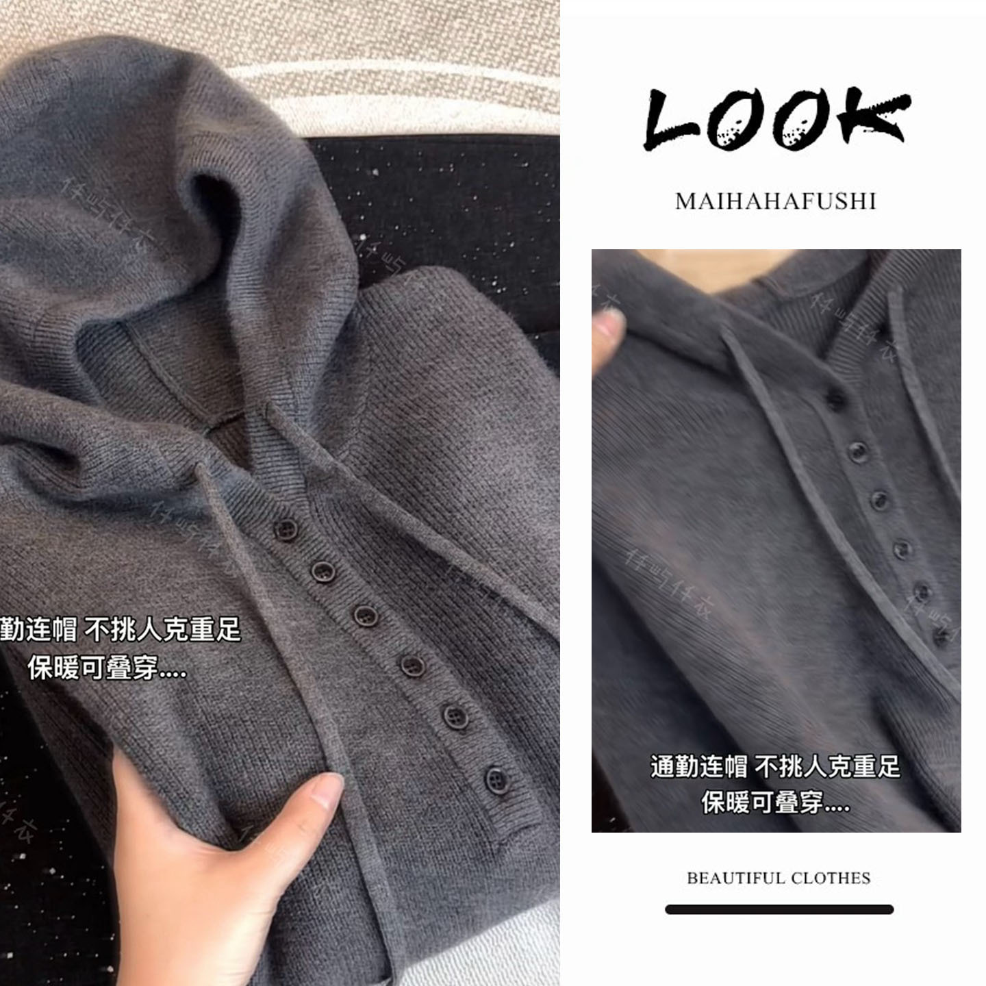 今年流行爆款休闲套装女秋冬季极简风宽松排扣连帽套头针织毛衣潮