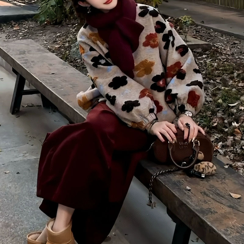 冬は今年は女性の新しい中国風の赤いニットセーターの馬のスカートの2つのセットのファッションが流行しています。