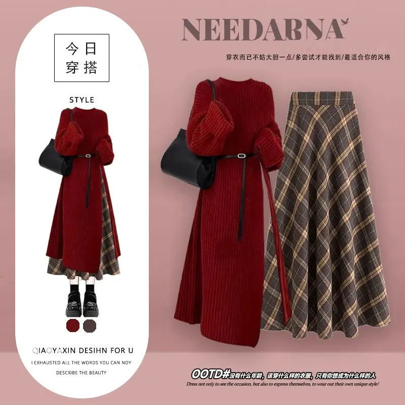 2024クリスマス赤秋冬女装高級感怠惰なニットセーターと痩せたチェックスカートの2セット