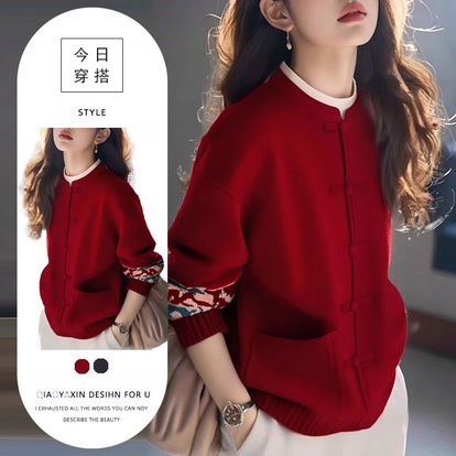 2024秋冬のユニークな新しい中国式のボタンの赤いニットの中国風の復古的な立襟のゆったりしたセーターのコートの女性