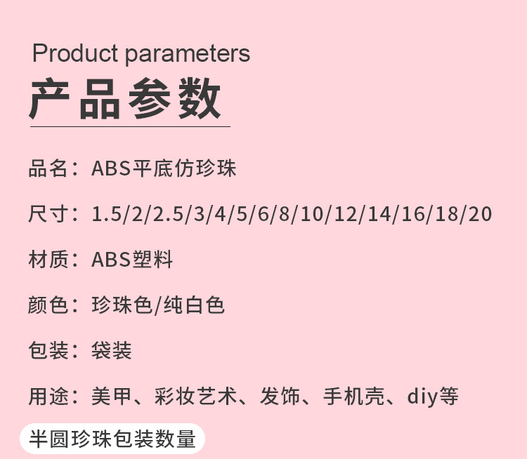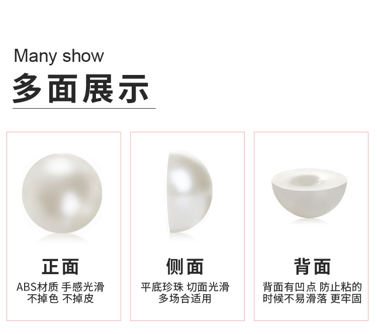ABS仿珍珠通孔材料是ABS塑料,耐摔打、耐高温、耐低温性优良;做出来的珍珠不掉皮,经过水磨抛光工艺去除毛边,使仿珍珠更光滑更亮;本产品可以用做服装鞋帽辅料,也可以做工艺品手工饰品配件;