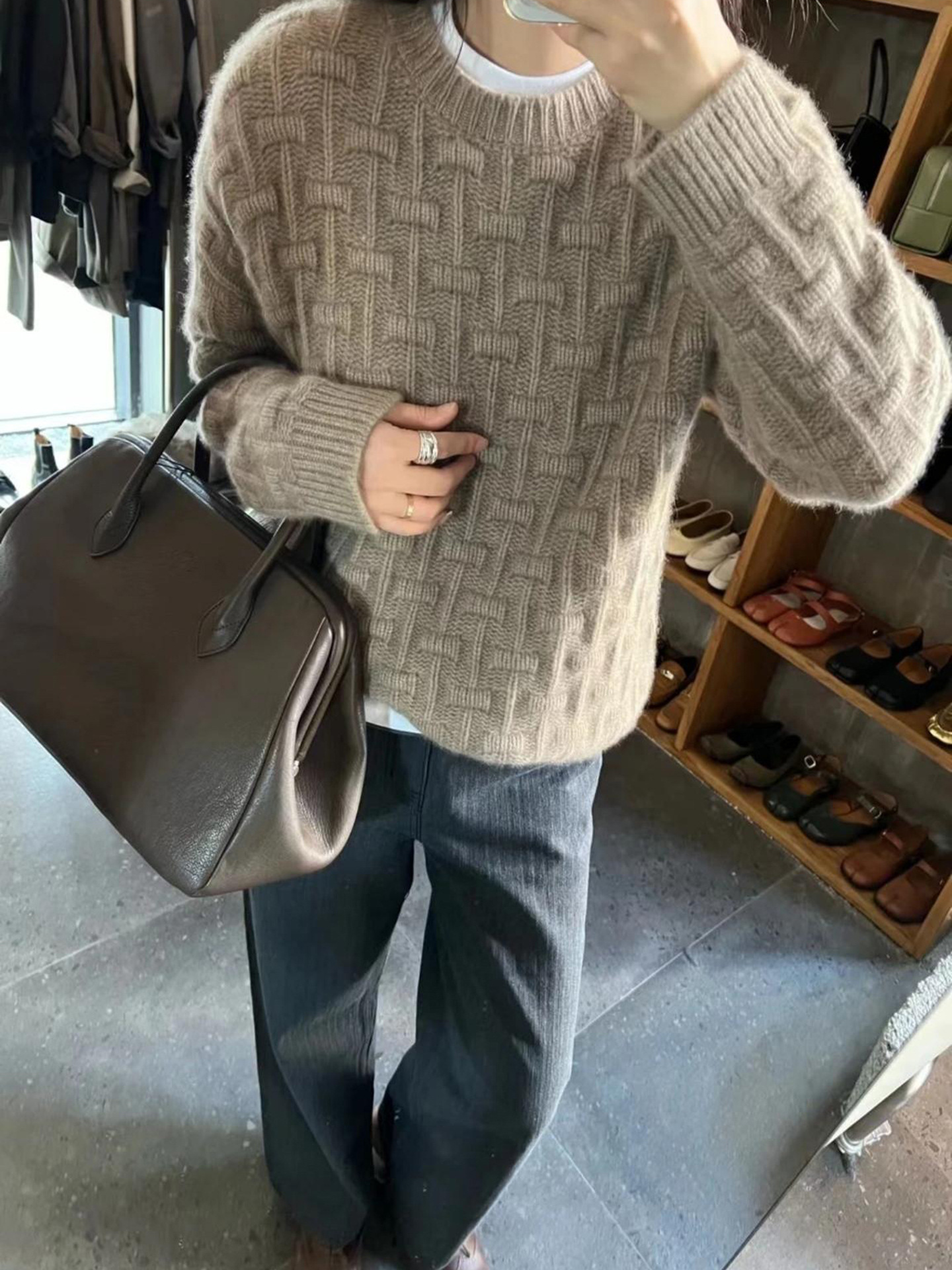 2025秋冬软糯花纱灰色纯羊毛衫女欧货圆领针织打底衫宽松加厚毛衣