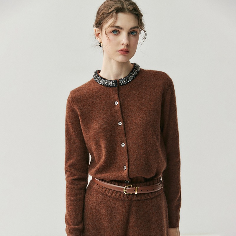 女式山羊绒衫针织开衫圆领烫钻设计毛衣外套秋冬新款软糯长袖外搭