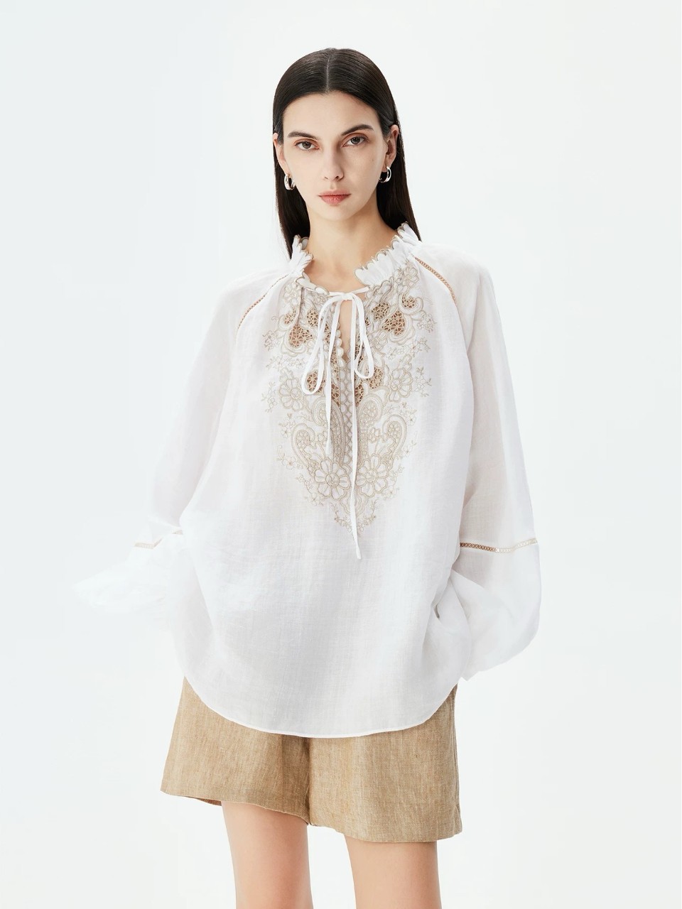 春夏新作100ラミー麻重工刺繍丸襟波辺リゾート風日焼け止めシャツ60