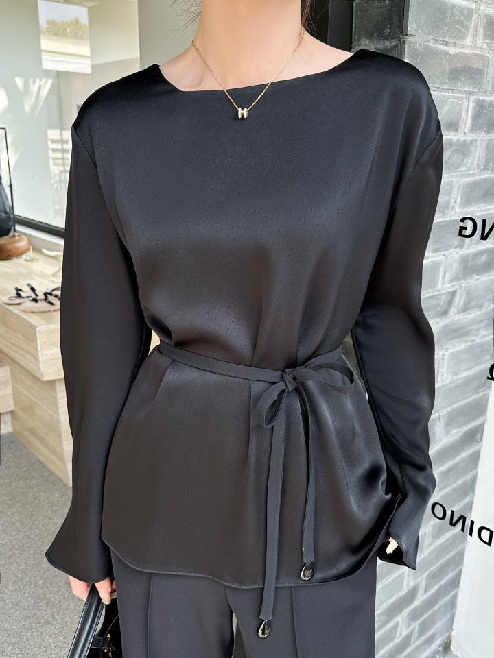 25新型高品質輸入三酢酸サテン麻上着の不規則な襟元とウエストロープのデザインシャツ124