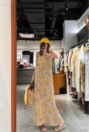 夏の新しいリゾートスタイルリネンプリント花柄ベストスカートサイドスリットミドル丈スカート112