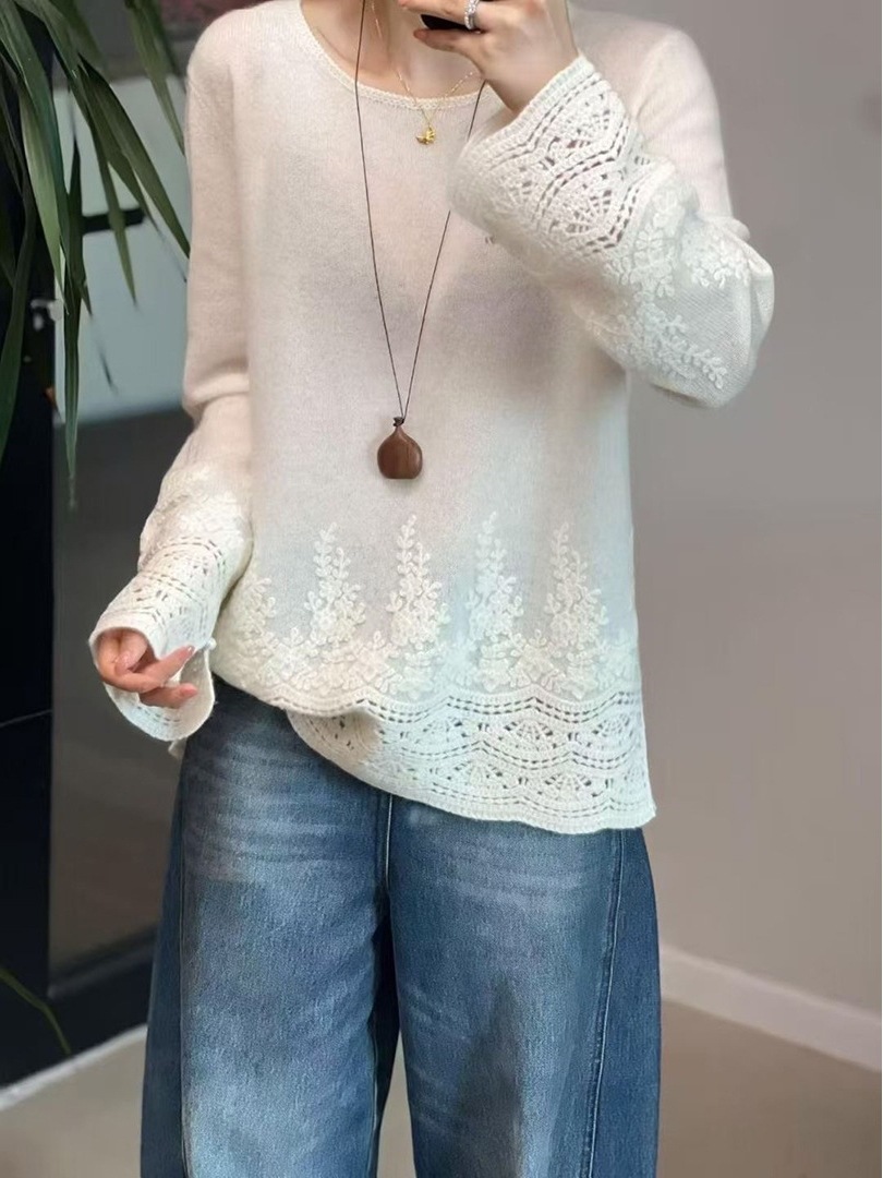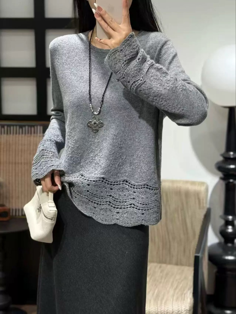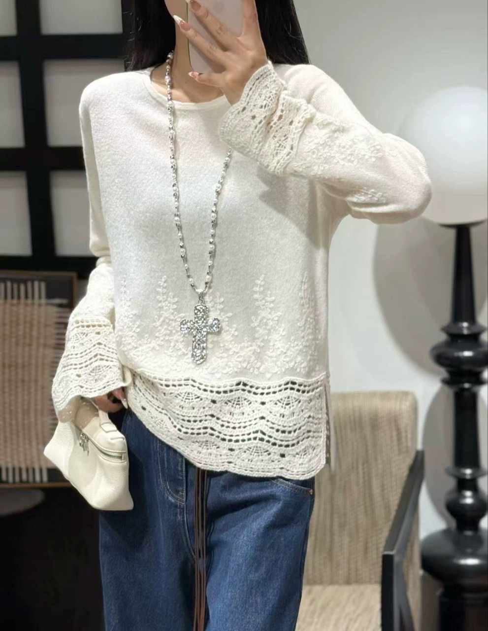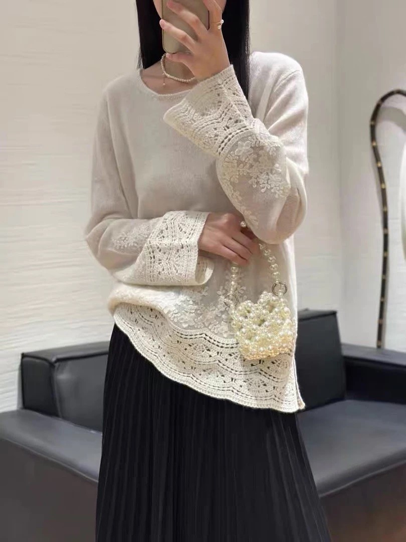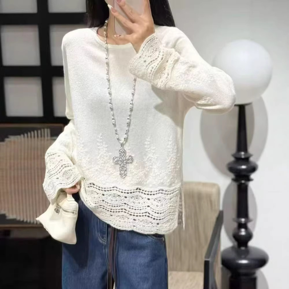 温柔气质百搭圆领拼接重工镂空蕾丝钩花羊毛针织衫毛衣女