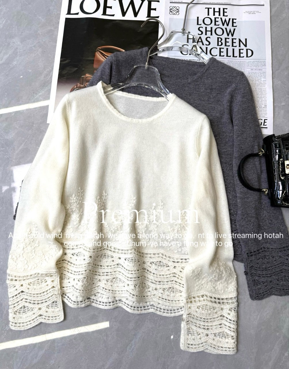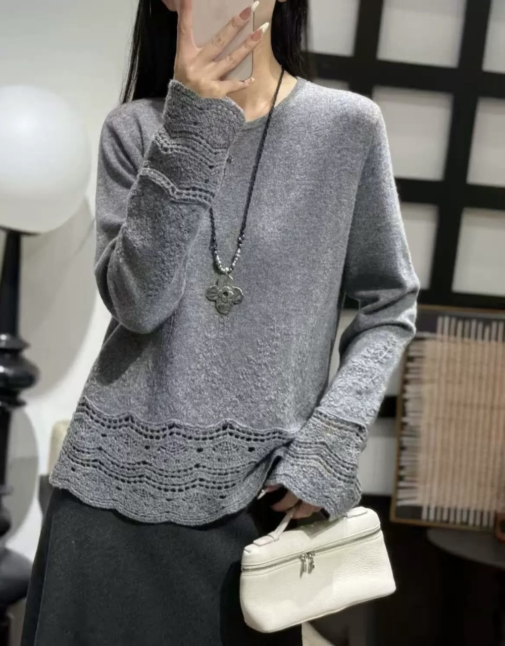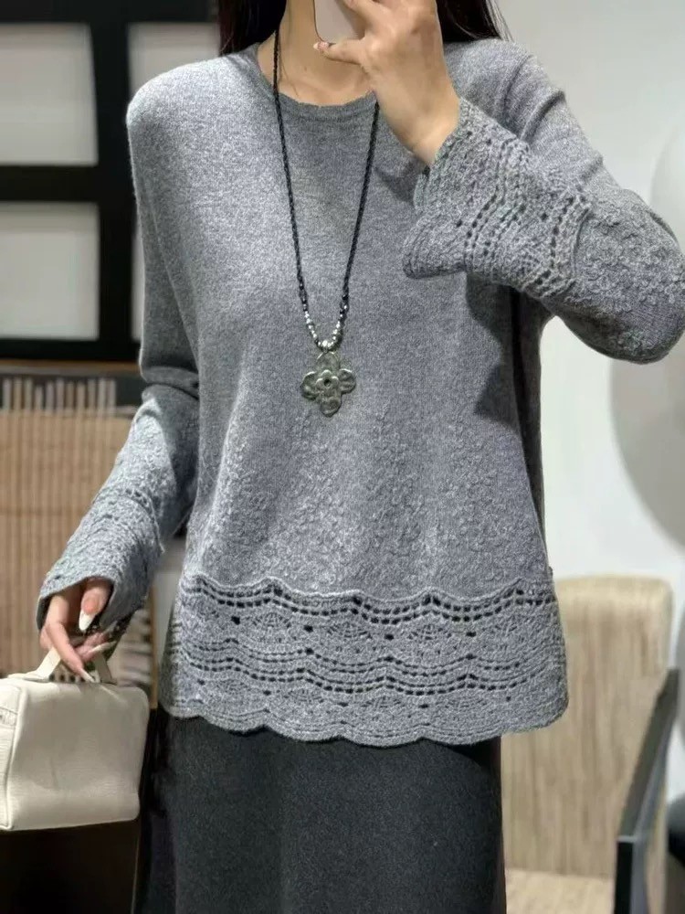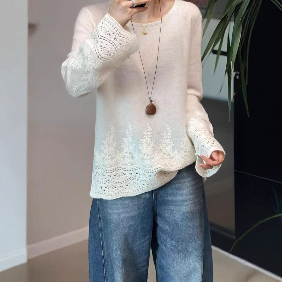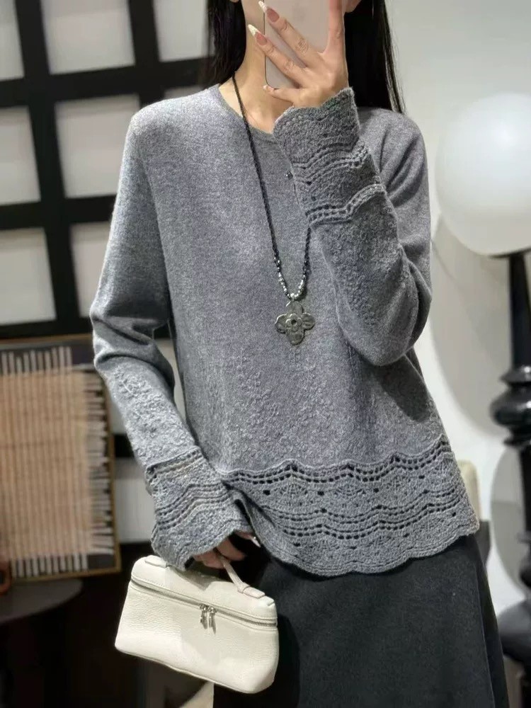 温柔气质百搭圆领拼接重工镂空蕾丝钩花羊毛针织衫毛衣女