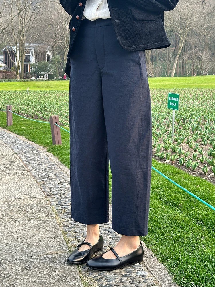 2025春の新型紺色の直筒鎌の広脚のズボンの百合の気質はやせている9分のズボンの13を現します。