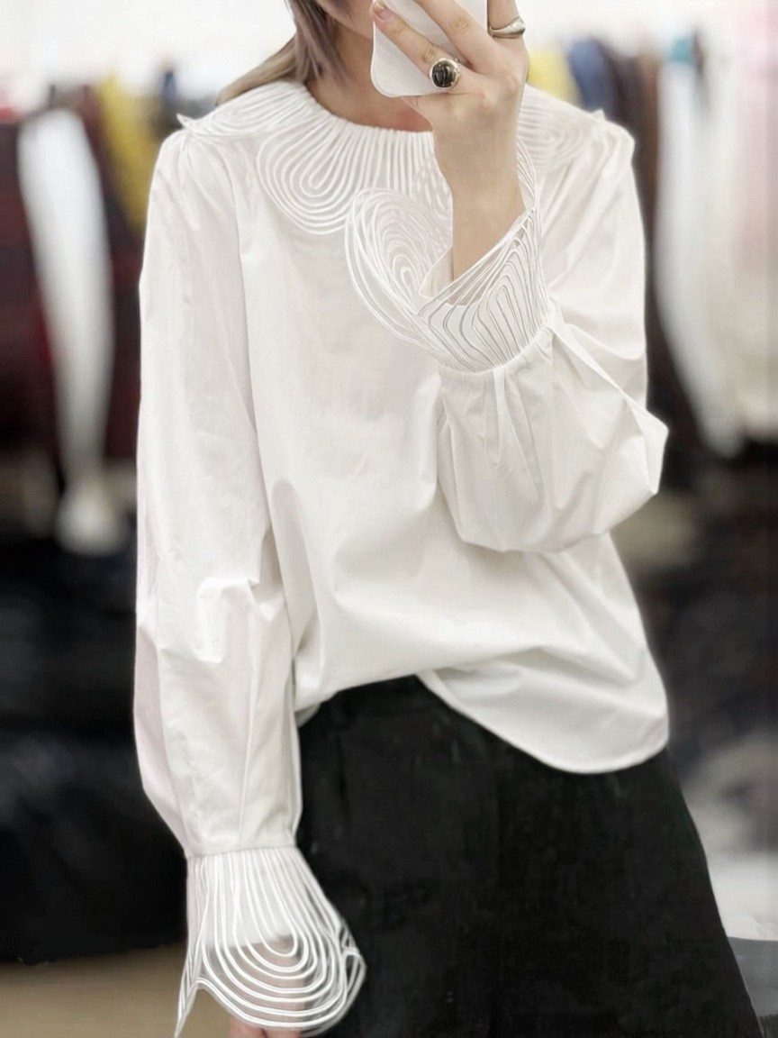 2026早春设计感泡泡袖立体绳绣花瓣领减龄百搭纯棉白衬衫64