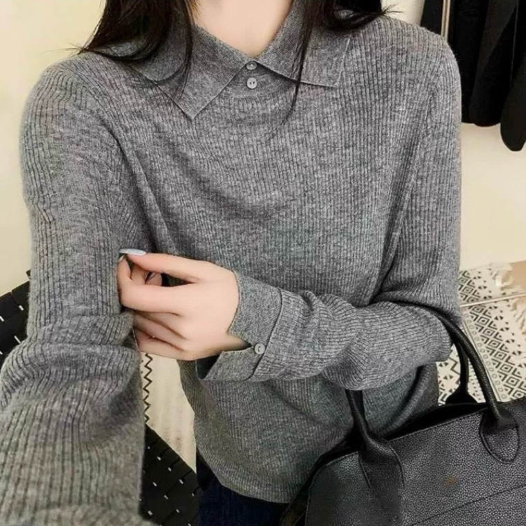 极简万搭翻领纽扣亲肤羊毛上衣Polo领休闲打底衫146