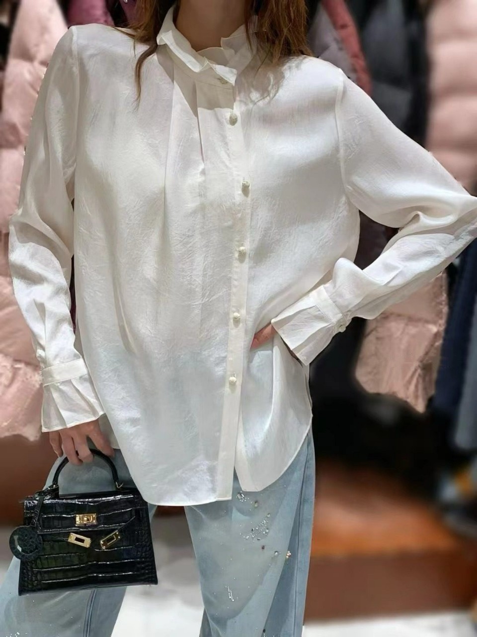 26早春新款简约百分百醋酸肌理衬衫花苞荷叶领上衣124