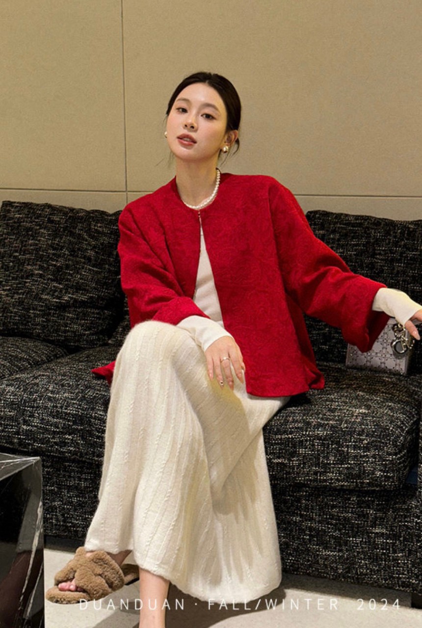 新年の軍服は白い中国の赤い詩意のジャカードの刺繍のコートのレリーフの筋肉のゆったりしている上着146を現します。