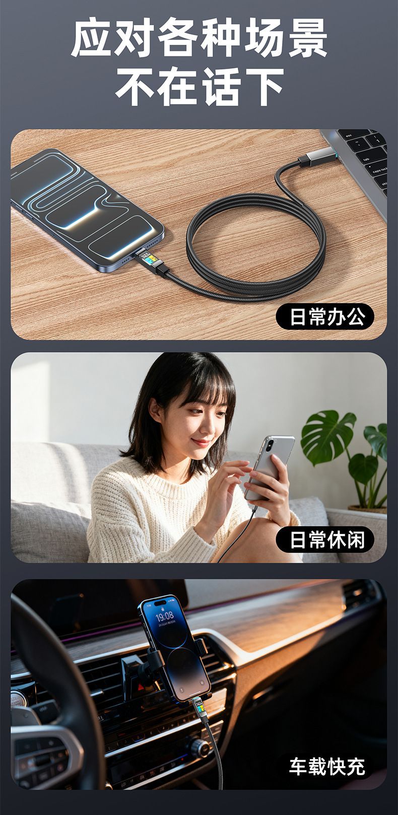 新型100W 3in1急速充電データケーブル 車載用 3in1 ライト付き 超急速充電 Apple iPhone対応