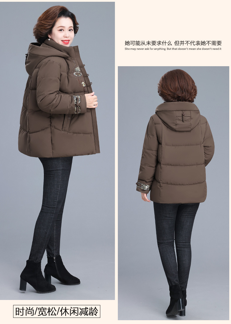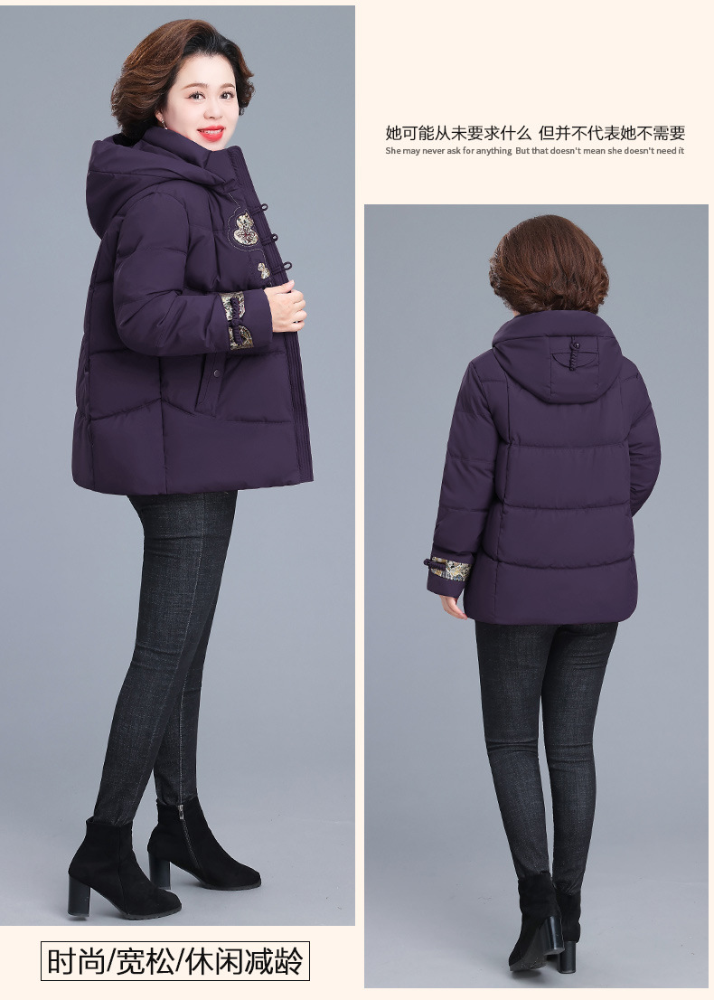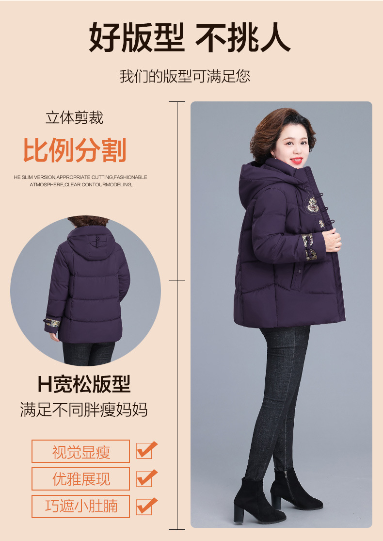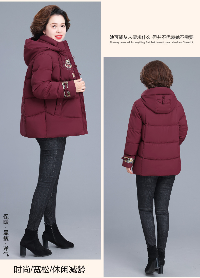 小柄な中年のお母さんの秋冬のコートの中高年の羽毛の綿服の女性の短いタイプの広い奥さんの冬は綿入れの上着を厚くします。